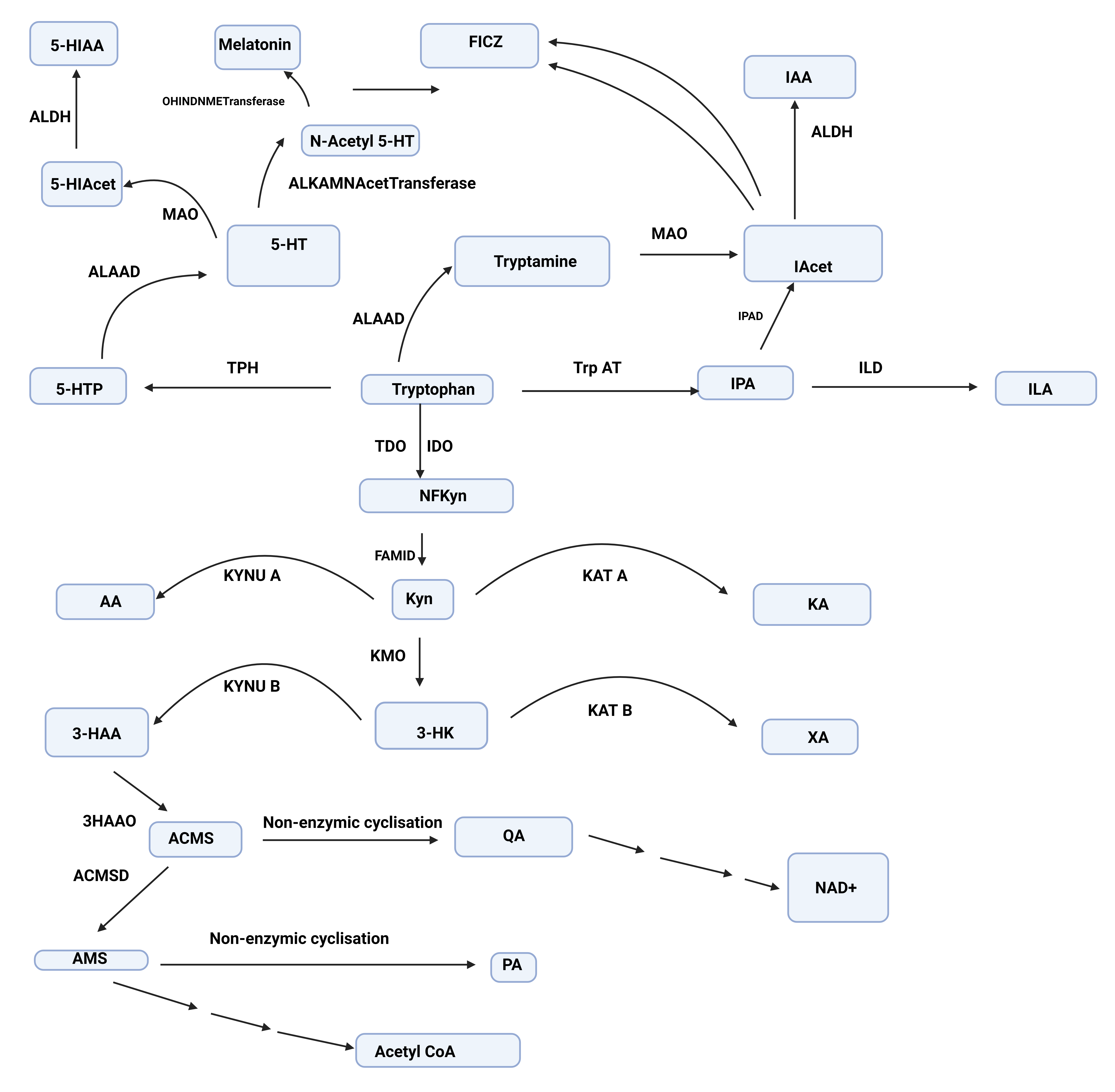 The tryptophan metabolic pathways. This Figure is based on Fig. 1 in [6] by Badawy AA-B. Tryptophan metabolism and disposition in cancer biology and immunotherapy. Biosci Rep 2022; 42:BSR20221682. https://www.ncbi.nlm.nih.gov/pmc/articles/PMC9653095/. Abbreviations used: Acet, acetaldehyde; ACMS, 2-Amino-3-carboxymuconic acid-6-semialdehyde: also known as acroleyl aminofumarate; ACMSD, 2-Amino-3-carboxymuconic acid-6-semialdehyde decarboxylase; ALAAD, aromatic L-amino acid decarboxylase; AlcAm, alkyl amino; ALDH, aldehyde dehydrogenase; AMS, 2-Aminomuconic acid -6-semialdehyde; AA, anthranilic acid; FAMID, N-formylkynurenine formamidase; FICZ, 6-formylindolo[3,2-b]carbazole; 3-HAA, 3-hydroxyanthranilic acid; 5-HIAcet, 5-hydroxyindoleacetaldehyde; 5-HIAA, 5-hydroxyindoleacetic acid; 5-HIAcet, 5-hydroxyindoleacetaldehyde; 3-HK, 3-hydroxykynurenine; 5-HT, 5-hydroxytryptamine or serotonin; 5-HTP, 5-hydroxytryptophan; IDO, indoleamine 2,3-dioxygenase; IAcet, indole acetaldehyde; IAA, indol-3-ylacetic acid; ILA, indol-3-yllactic acid; ILD, indole lactate decarboxylase; IPAD, indolepyruvic acid decarboxylase; IPA, indol-3-ylpyruvic acid; KA, kynurenic acid; KYNU, kynureninase; KAT, kynurenine aminotransferase; NFKyn, N-formylkynurenine; MAO, monoamine oxidase; NAD+, oxidised nicotinamide-adenine dinucleotide; OHIndole, hydroxyindole; OHINDMETransfersase, hydroxyindole methyl transferase; PA, picolinic acid; QA, quinolinic acid; TDO, tryptophan 2,3-dioxygenase; Trp AT, tryptophan aminotransferase; TPH, tryptophan hydroxylase; XA, xanthurenic acid; kyn, kynurenine; KMO, Kynurenine-3-monooxygenase; 3HAAO, 3-hydroxyanthranilate 3,4 dioxygenase.