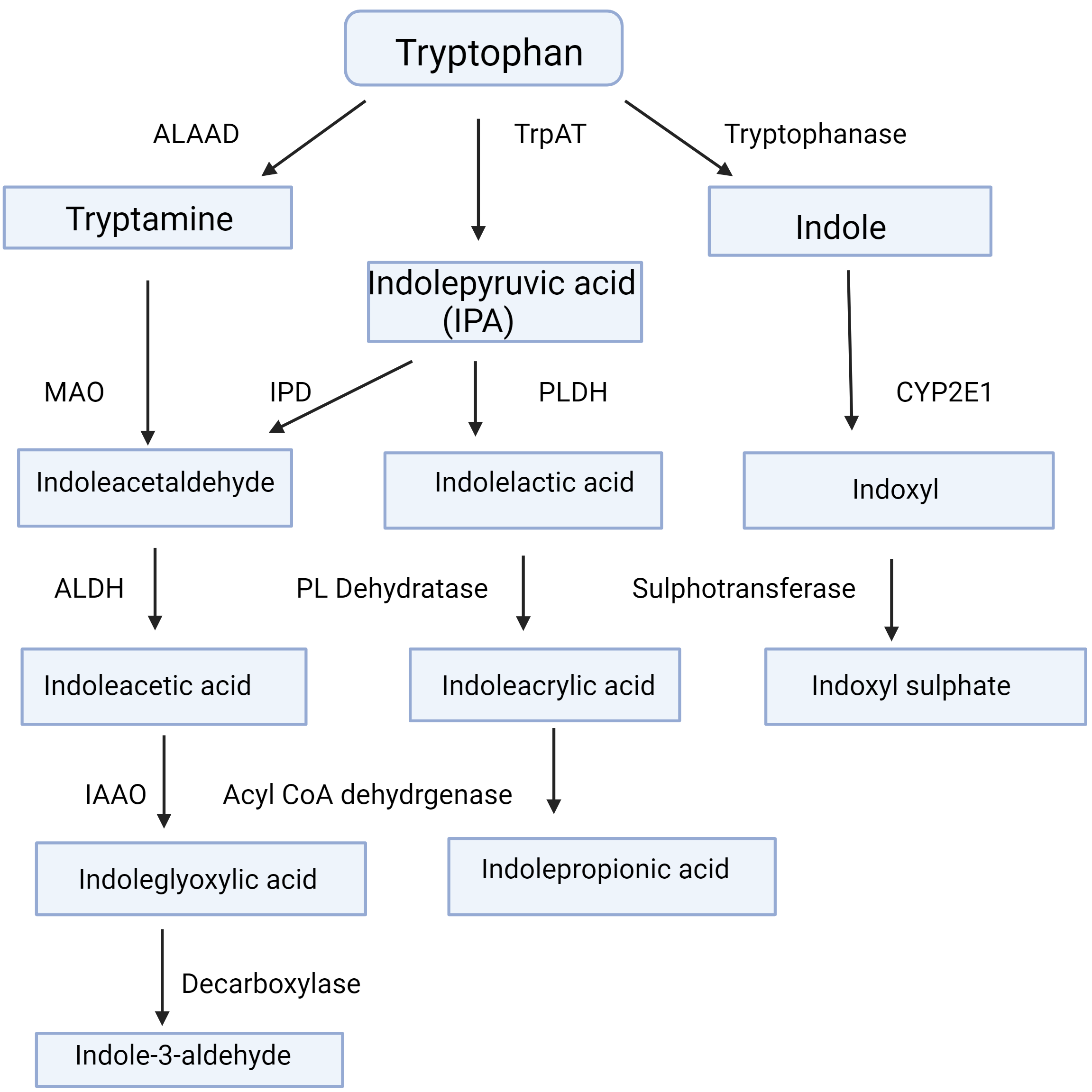 Tryptophan metabolism by gut microbiota. This Figure is based on Fig. 2 in [6] by Badawy AA-B. Tryptophan metabolism and disposition in cancer biology and immunotherapy. Biosci. Rep 2022; 42: BSR20221682. https://www.ncbi.nlm.nih.gov/pmc/articles/PMC9653095/. Abbreviations: ALAAD, aromatic L-amino acid decarboxylase; ALDH, aldehyde dehydrogenase; CYP2E1, cytochrome P-450 2E1; IAAO, indoleacetic acid oxidase; IPD, indolepyruvate decarboxylase; MAO, monoamine oxidase; PL Dehydratase, phenyllactate dehydratase; PLDH, phenyllactate dehydrogenase; TrpAT, tryptophan aminotransferase.