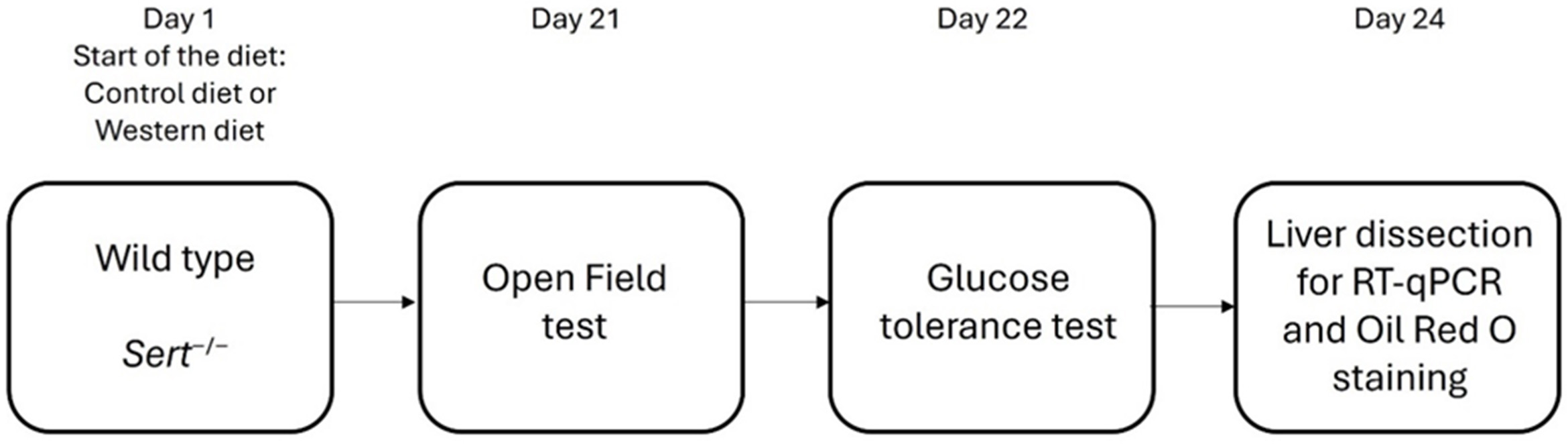 One-year-old female Sert-/- mice and their wild-type (WT) littermates were subjected to a control diet (CD) or the WD for a duration of three weeks. The WD had a higher caloric content and was characterized by an elevated saturated fat content (21%) compared to the CD (4.5%) and contained 0.2% cholesterol. Mice were evaluated for anxiety-like behavior, exploration and locomotor activity in the open field test, as well as glucose tolerance and histological indicators of hepatic steatosis. Hepatic pro-inflammatory and metabolism-related gene expression and markers of nitrosative stress, were analyzed utilizing real-time polymerase chain reaction (RT-PCR) and correlated with behavioral and histological outcomes.