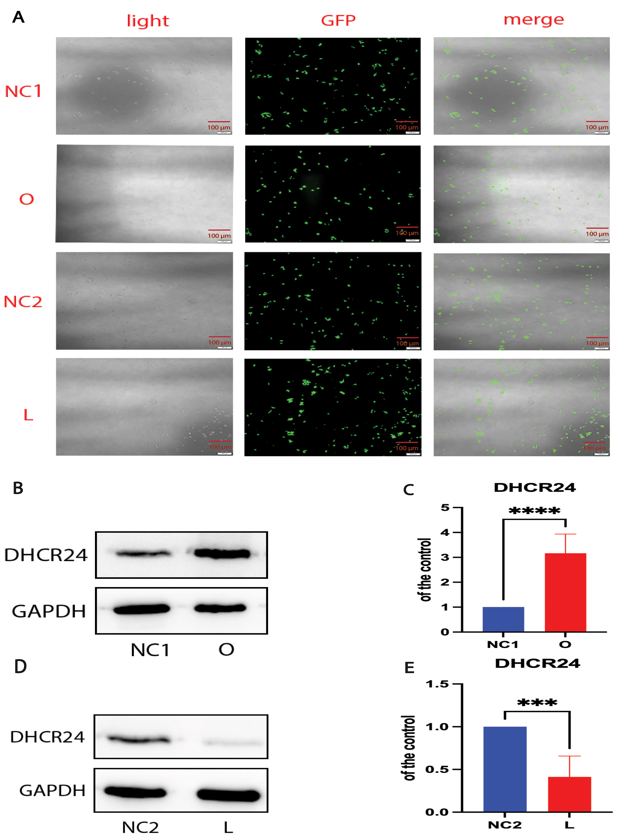 Fig. 1. Cell models were successfully transfected by DHCR24 knockdown and knockin. The human SH-SY5Y cells were transfected with the lentivirus-delivered DHCR24-shRNA, DHCR24-cDNA, and lentiviral vectors to produce the low-expressing DHCR24 cell group (L), over-expressing DHCR24 cell group (O), vector control cell groups (negative control group, NC), respectively. (A) DHCR24-shRNA, DHCR24-cDNA, and the lentiviral vector were strongly expressed in SH-SY5Y cells, as indicated by GFP (green) under fluorescence microscopy. Scale bar = 100 µm. (B,D) Western blot analysis of extracts from the low-expressing DHCR24 cells (L), over-expressing DHCR24 cells (O), and vector control cells (NC), was performed. The representative western blots of DHCR24 protein are shown in (B,D). (C,E) Quantifications of three experiments are shown in (C,E). Results shown are the mean