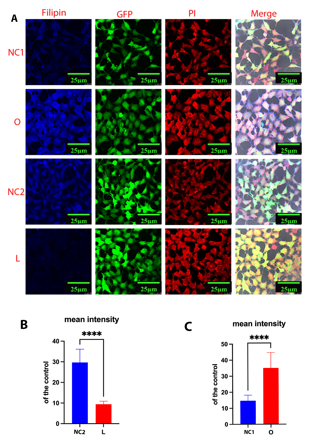 Fig. 2. Cellular cholesterol level as analyzed by Filipin III staining. Cells from the low-expressing DHCR24 cells (L), over-expressing DHCR24 cells (O), and vector control cells (NC) were stained with Filipin III. (A) Whole-cell staining of fixed SH-SY5Y cells. Filipin III stains cholesterol in the plasma membrane and in intracellular compartments. Blue staining is Filipin III, red staining is PI (propidium iodide), and green staining is GFP fluorescence. The final panel shows the merged image from the three channels. Scale bar = 25 µm. (B,C) Filipin fluorescence intensity of cholesterol in whole cells was measured using ImageJ2 Software in differential cell groups. Results shown are the mean