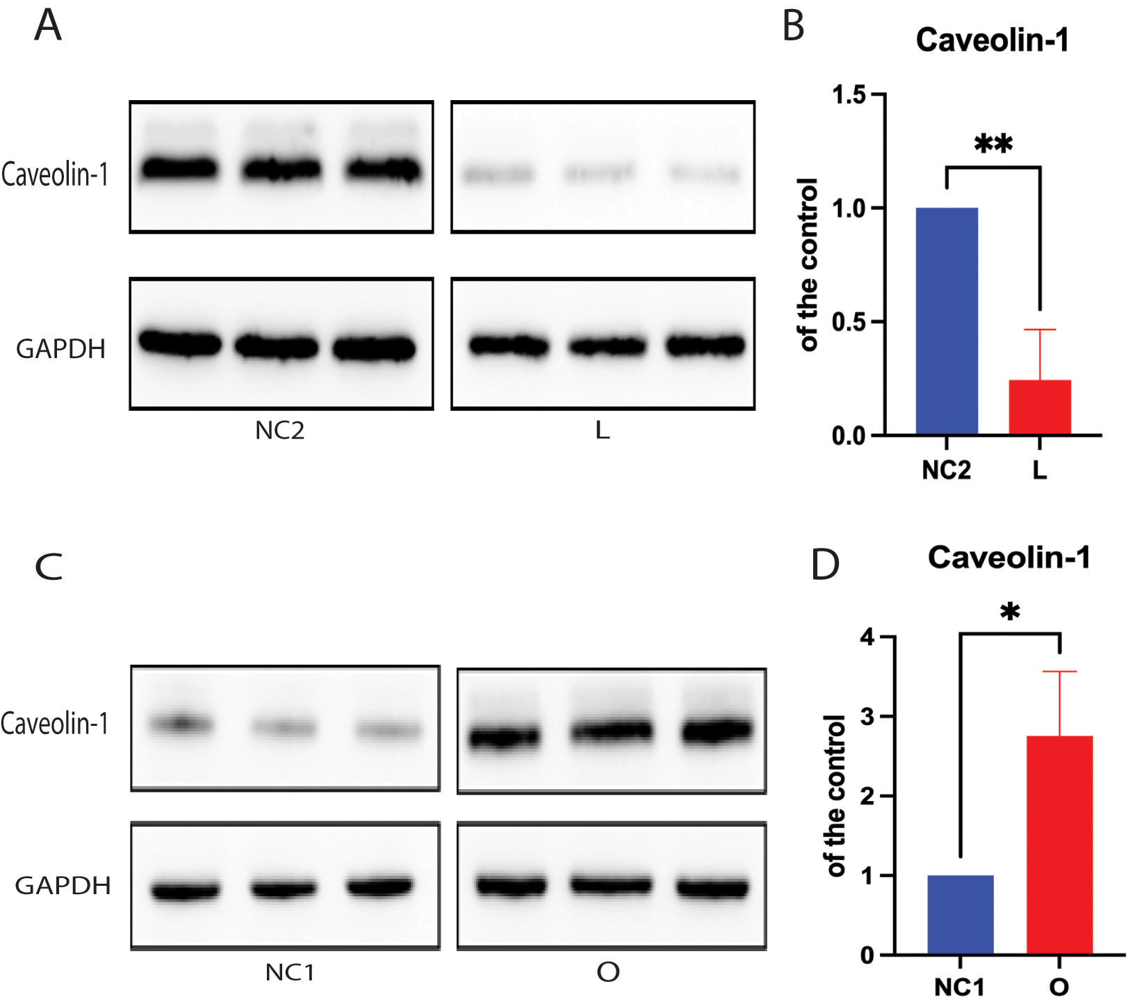 Fig. 3. Cellular cholesterol loss leads to downregulation of the lipid-raft protein caveolin-1. For Protein extracts from low-expressing DHCR24 cells (L), over-expressing DHCR24 cells (O), and vector control cells (NC) were used for Western blot analysis of caveolin-1 expression. (A,B) The representative Western blot of caveolin-1 protein and quantification of three experiments are shown in (A,B) in the low-expressing DHCR24 cells (L) and vector control cells (NC2). (C,D) The representative Western blot of caveolin-1 protein and quantification of three experiments are shown in (C,D) in the over-expressing DHCR24 cells (O) and vector control cells (NC1). Results shown are the mean