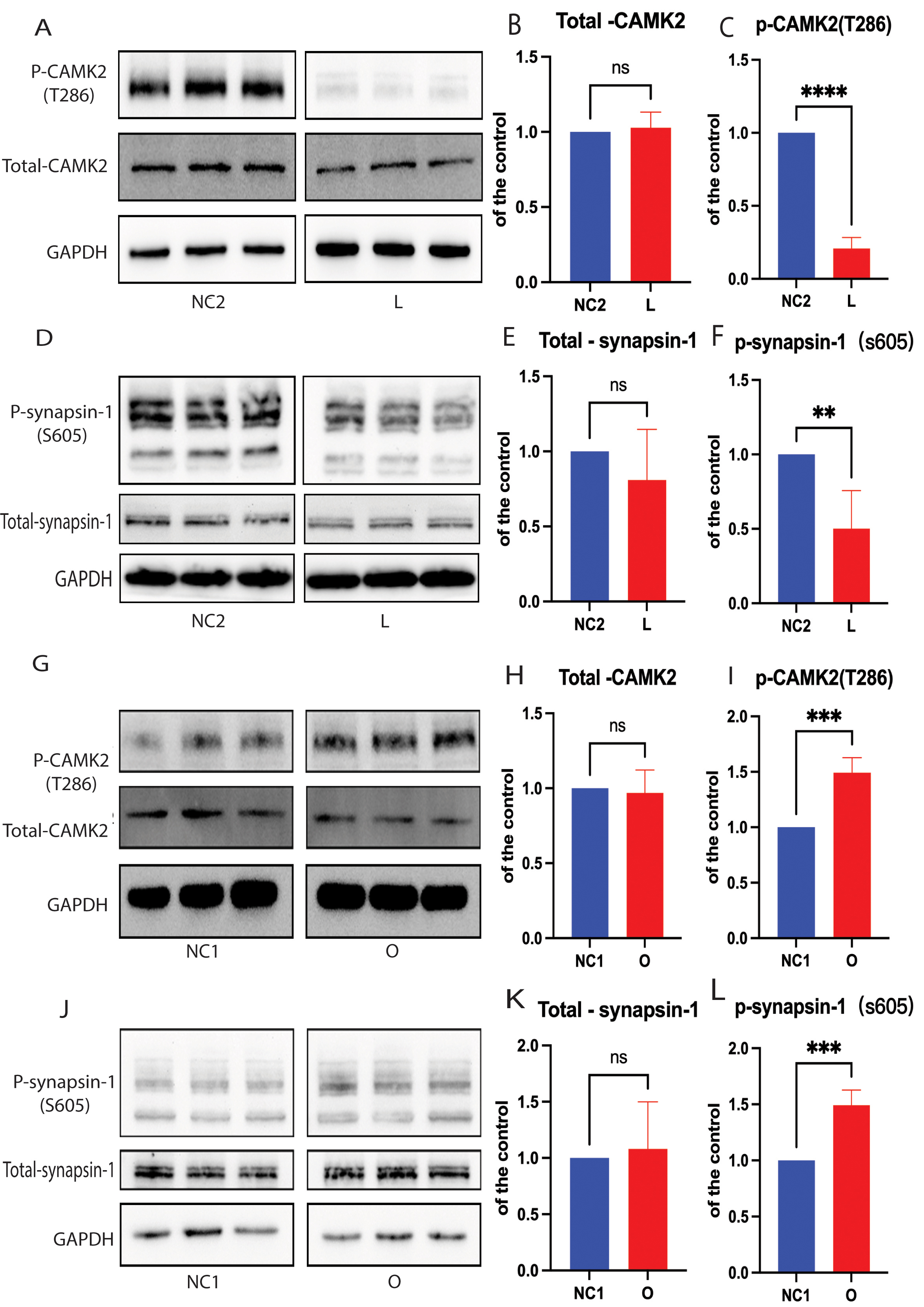 Fig. 4. Cellular cholesterol loss lowers the level of p-synapsin-1 protein by CAMK2 signaling. For Western blot analysis of total synapsin-1, phosphorylated synapsin-1 (p-synapsin-1), total CAMK2, and phosphorylated CAMK2 (p-CAMK2). Protein extracts were obtained from the low-expressing DHCR24 cells (L), over-expressing DHCR24 cells (O), and vector control cells (NC). (A–F) Representative Western blots of total synapsin-1 and p-synapsin-1, total CAMK2, and p-CAMK2 and quantification of three experiments are shown in (A–F) for the low-expressing DHCR24 cells (L) and vector control cells (NC2). (G–L) Representative Western blots of total synapsin-1, p-synapsin-1, total CAMK2, and p-CAMK2; quantification of three experiments are shown in (G–L) for over-expressing DHCR24 cells (O) and vector control cells (NC1). Results shown are the mean