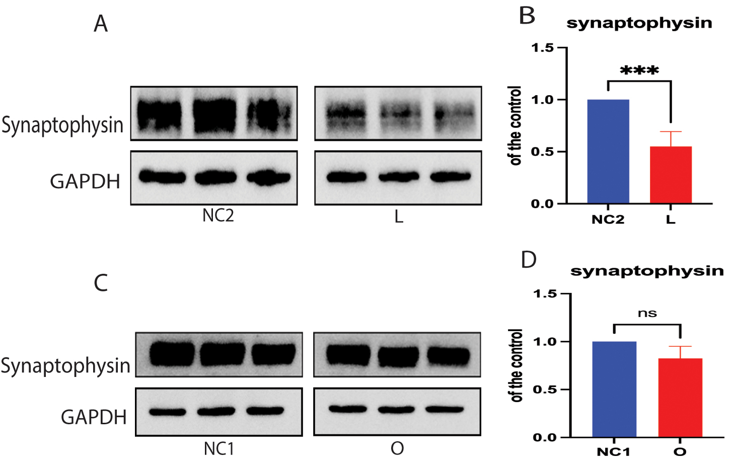 Fig. 5. Cellular cholesterol loss downregulated the expression of synaptophysin protein. Protein extracts from low-expressing DHCR24 cells (L), over-expressing DHCR24 cells (O), and vector control cells (NC) were used for Western blot analysis of synaptophysin protein. (A,B) The representative Western blot of synaptophysin protein and quantification of three experiments is shown in (A,B) in low-expressing DHCR24 cells (L) and vector control cells (NC2). (C,D) Representative Western blot analysis of synaptophysin protein and quantification of three experiments is shown in (C,D) for over-expressing DHCR24 cells (O) and vector control cells (NC1). Results shown are the mean