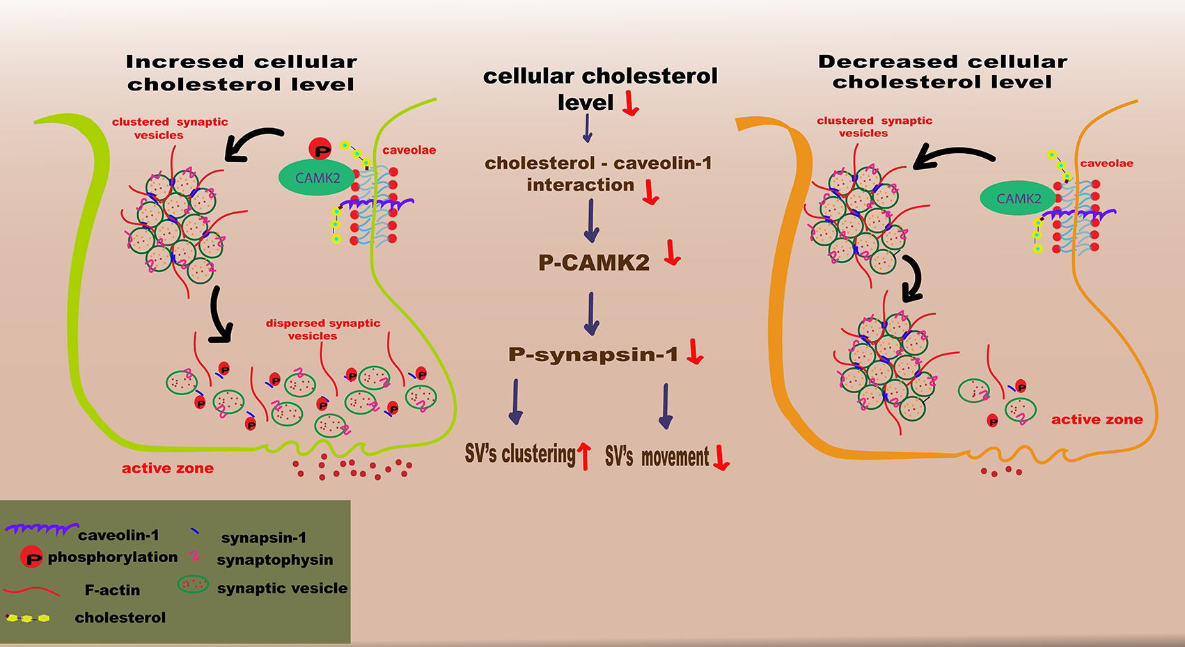 In DHCR24-silenced cells, the loss of cellular cholesterol caused by knock-down of DCHR24 resulted in a significant decrease in the levels of phosphorylated CAMK2 (p-CAMK2) and phosphorylated synapsin-1 (p-synapsin-1) compared to control cells. The reduction in p-CAMK2 and p-synapsin-1 could disrupt SV mobility, thereby reducing replenishment of the readily releasable pool (RRP) from the reserve pool (RP). Furthermore, cells with DHCR24 knock-down showed downregulation of caveolin-1, a crucial lipid raft marker, compared to control cells. Conversely, elevated cellular cholesterol levels caused by knock-in of DHCR24 reversed the effects of cholesterol deficiency, suggesting that CAMK2-mediated synapsin-1 phosphorylation may be regulated in a lipid raft-associated manner. Additionally, we found that cellular cholesterol loss could significantly downregulate the expression of synaptophysin protein, which is vital for SV biogenesis and synaptic plasticity.