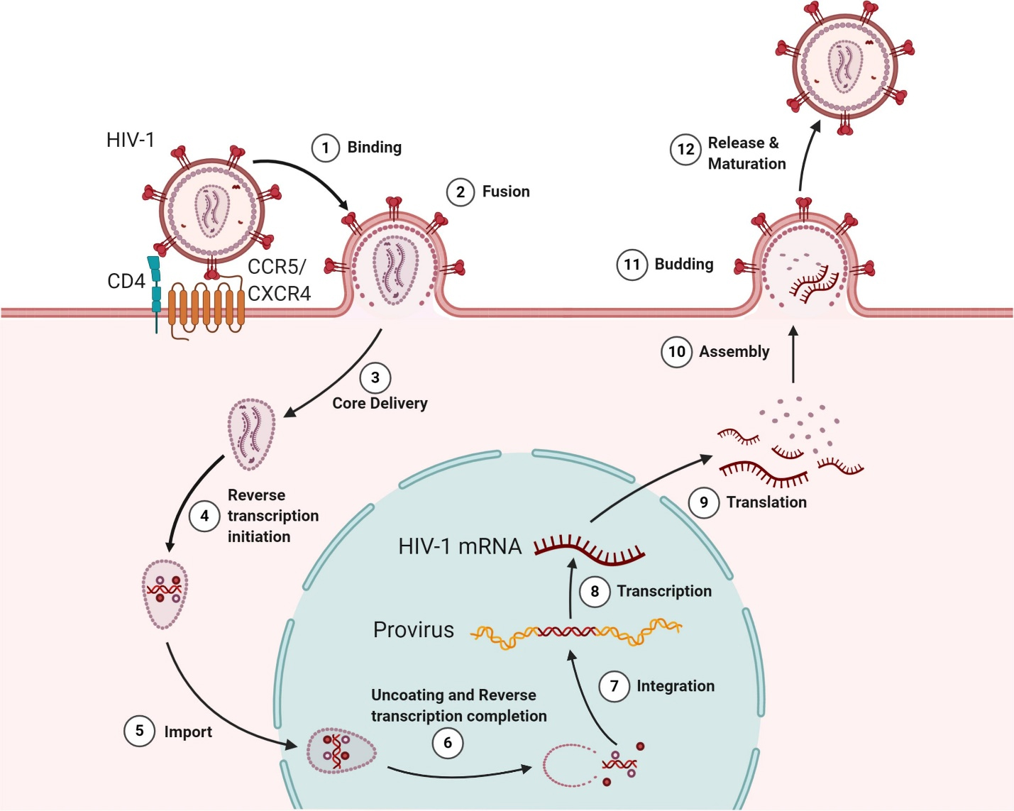 The lifecycle of Human Immunodeficiency Virus (HIV). The infection initiates when the viral envelope glycoprotein binds to the CD4 receptor and coreceptors (CXCR4/CCR5) on the host cell surface (Step 1), facilitating viral entry and membrane fusion (Step 2). Once inside the host cell, the viral core is delivered (Step 3), and reverse transcription occurs in the cytoplasm (Step 4). The viral core is then transported into the nucleus (Step 5), where reverse transcription is completed, and the virus undergoes uncoating (Step 6). The enzyme integrase incorporates the viral genome into the host’s DNA (Step 7). Proviral transcription produces viral RNAs (Step 8), which are transported to the cytoplasm for protein synthesis (Step 9). Full-length viral RNA and proteins are assembled into new virions (Steps 10 and 11). Finally, the newly formed viral particles are released from the host cell, followed by maturation into fully infectious virions (Step 12). Reprinted (adapted) from [94] under a Creative Commons license. CXCR4, C-X-C chemokine receptor type 4.