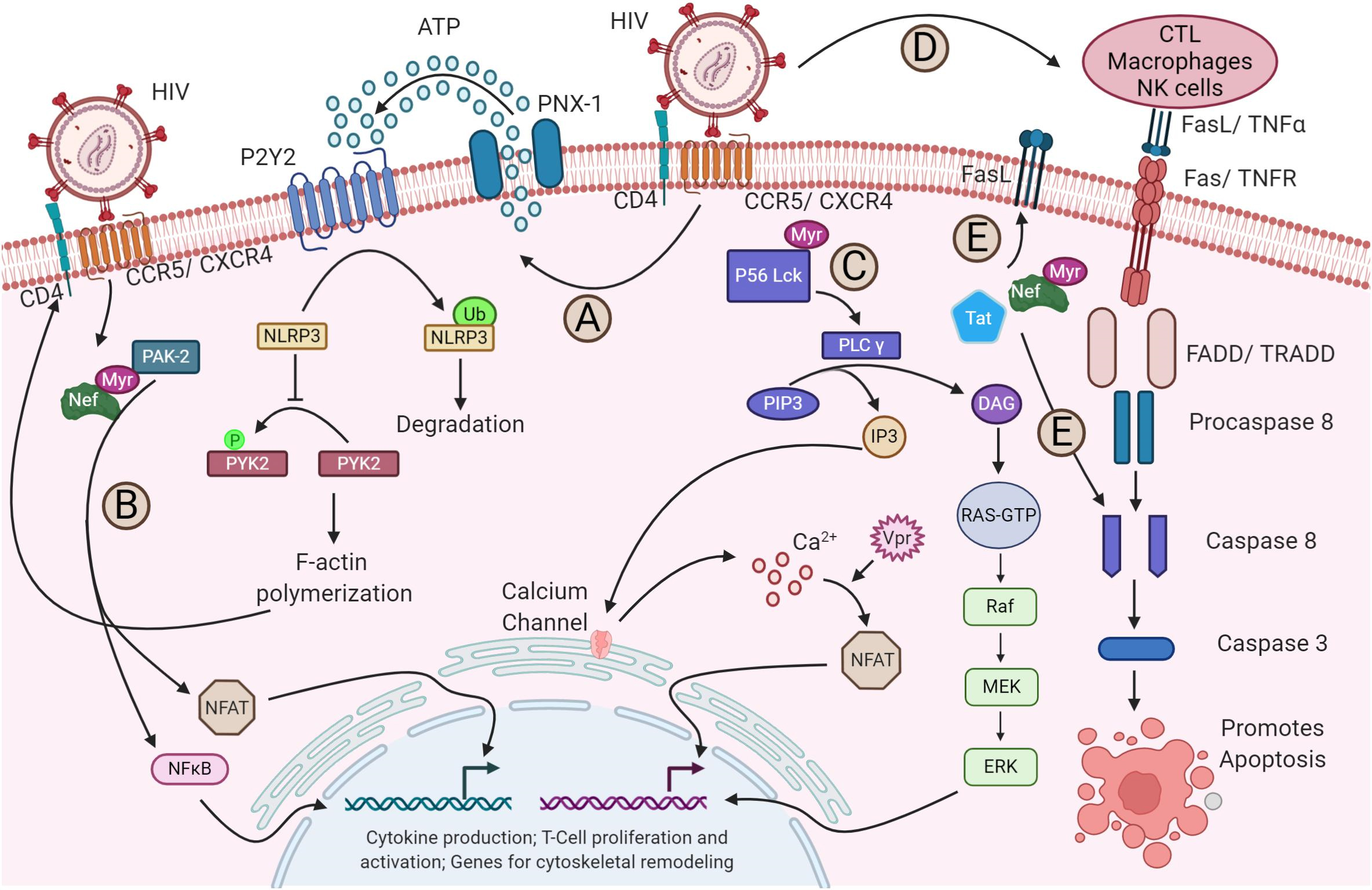Upon HIV-1 binding to its receptors and coreceptors, various signaling pathways