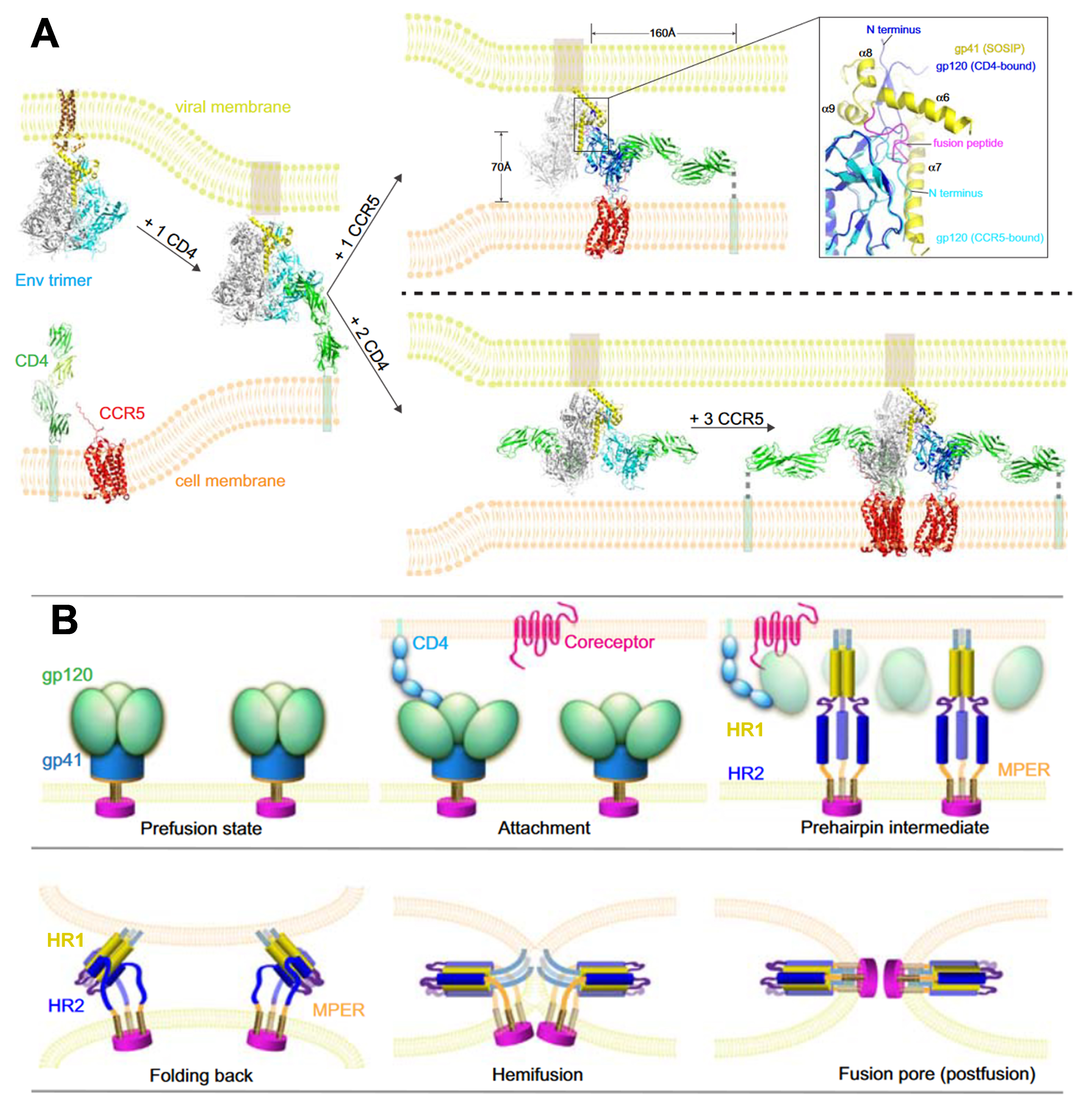 In the absence of CCR5 binding, the necessity of a coreceptor, despite gp120 dissociation, to activate gp41 independently of CCR5 binding raises a crucial question. Primarily, gp120 dissociation without a coreceptor might prove nonproductive due to the spatial challenge. When the virion binds to the target cell surface with the Env trimer and interacts exclusively with CD4, the gp41 fusion peptide is approximately 160 Å away from the cell membrane surface (Fig. 4A). Premature dissociation of gp120 would prevent the fusion peptide from reaching the target membrane [120]. gp120 must bind to CCR5 to bridge this gap and facilitate membrane fusion, bringing the fusion peptide within a range of approximately 70 Å from the target membrane (Fig. 4A). This distance aligns with the proposed traversal distance of the fusion peptide during gp41 refolding to reach the target receptor [123, 124]. Consequently, CCR5 serves to promote membrane fusion by stabilizing CD4-induced conformational changes. Moreover, the formation of fusion pores likely necessitates the involvement of multiple Env trimers, as demonstrated in other viral fusion proteins [125]. A stable Env-receptor complex would be advantageous for consistent conformational changes across several Env trimers. Thus, to facilitate productive membrane fusion, a coreceptor stabilizes and anchors the conformation of the Env trimer induced by CD4. Therefore, even from a mechanical standpoint, the designation of the HIV-1 primary receptor and coreceptor appears serendipitous.