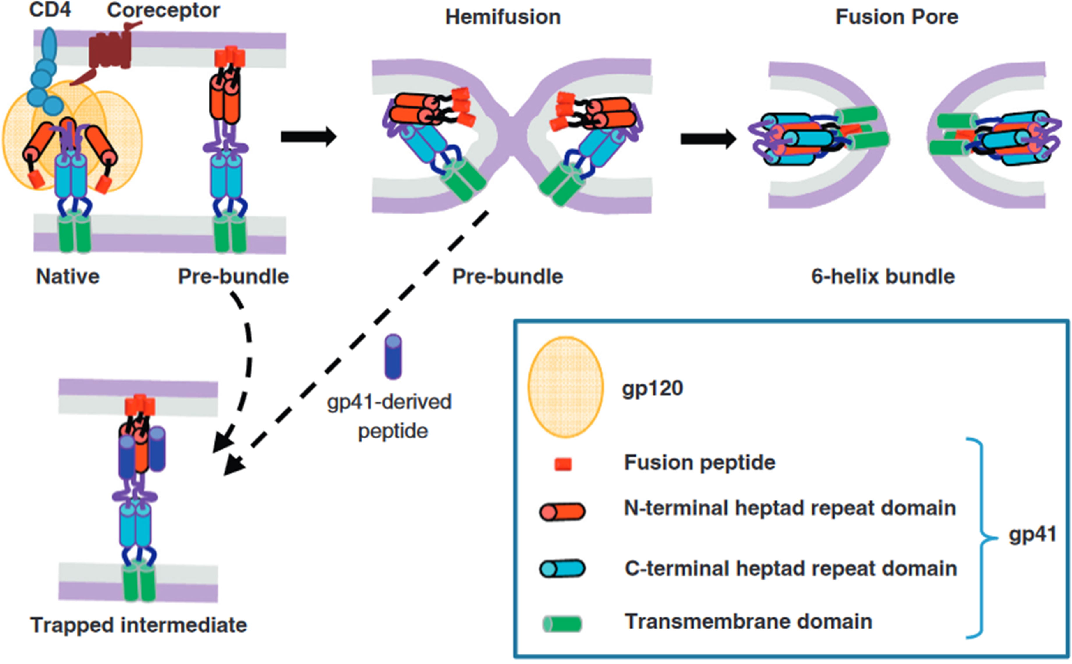 HIV Env-mediated membrane fusion and its inhibition. The key steps of HIV membrane fusion follow the engagement of the CD4 receptor and coreceptor by the gp120 subunit of the Env glycoprotein. The gp41 subunit undergoes a structural transition from its native conformation to various intermediate states, forming a stable six-helix bundle in the post-fusion state. This transformation involves the exposure of heptad repeat (HR) domains, depicted as red (N-terminal HR) and blue (C-terminal HR) cylinders. Inhibitory peptides derived from the C-terminal HR region (dark blue) can bind to the N-terminal HR (red), blocking the formation of the six-helix bundle and halting fusion. The dashed arrow between the hemifusion state and the peptide-bound intermediate indicates that even late-stage intermediates, including nascent fusion pores, can revert in the presence of these peptides, preventing complete fusion. Reproduced with permission from Gregory B Melikyan, HIV entry: a game of hide-and-fuse; published by Elsevier, 2014 [137].
