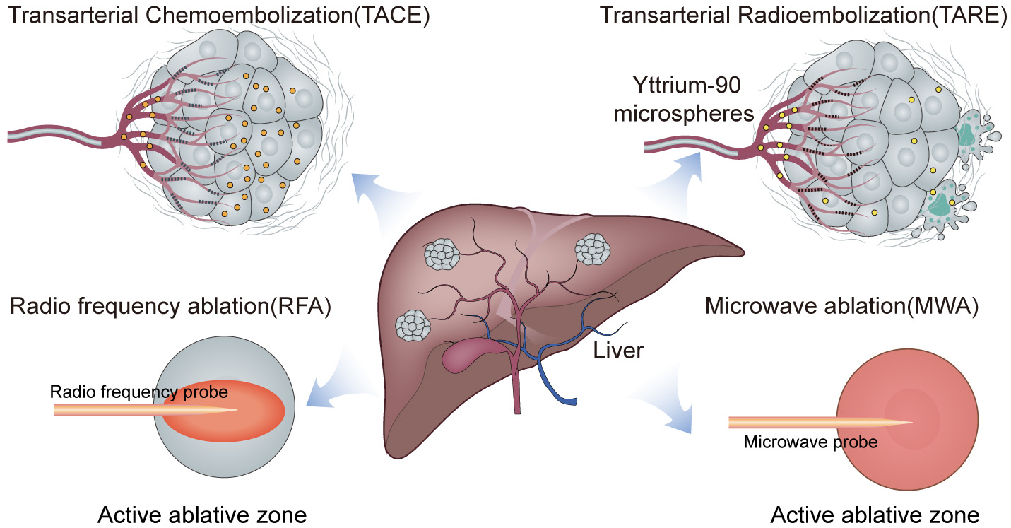 Liver cancer, primarily hepatocellular carcinoma (HCC), is a leading cause of cancer-related mortality worldwide. Its incidence is closely linked to the prevalence of chronic liver diseases, such as hepatitis and cirrhosis [10]. The pathophysiology of liver cancer involves a complex interplay of genetic, epigenetic, and environmental factors, contributing to the heterogeneity of this disease [11]. Interventional therapies for liver cancer have been developed to target tumors in a minimally invasive manner, often providing a therapeutic option for patients who are not candidates for resection or transplantation. TACE delivers chemotherapeutic agents directly to the tumor, combined with embolic materials to restrict the tumor’s blood supply [12, 13]. RFA and microwave ablation (MWA) use thermal energy to induce cellular death within the tumor [14, 15]. Trans-arterial radioembolization (TARE) involves the delivery of radiation-emitting beads to the tumor vasculature, offering a targeted radiological approach [16].