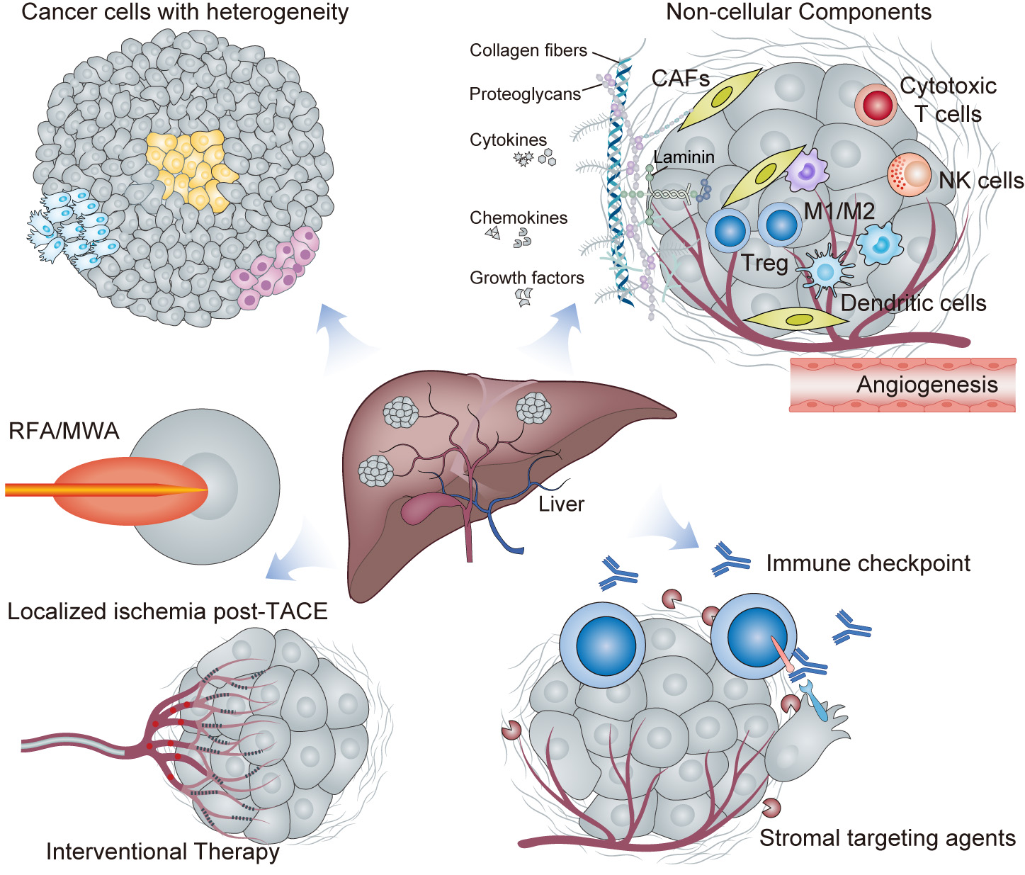 Complex interplay in the liver cancer tumor microenvironment (TME). This figure provides a comprehensive portrayal of the hepatocellular carcinoma (HCC) TME within a liver lobule, highlighting the cellular heterogeneity, immune cell diversity with both anti- and pro-tumor roles, the transition of fibroblasts to cancer-associated fibroblasts (CAFs), and tumor angiogenesis. The non-cellular matrix contains extracellular matrix (ECM) components and signaling molecule gradients. The effects of interventional therapies such as TACE and RFA/MWA on the TME are depicted schematically, showing altered signaling and cell fate. Finally, therapeutic modulation strategies such as immune checkpoint blockade and stromal disruption are represented to show TME “normalization” post-treatment. This figure encapsulates the dynamic and complex interactions occurring within the HCC TME, and which are essential for understanding and developing targeted therapeutic interventions.
