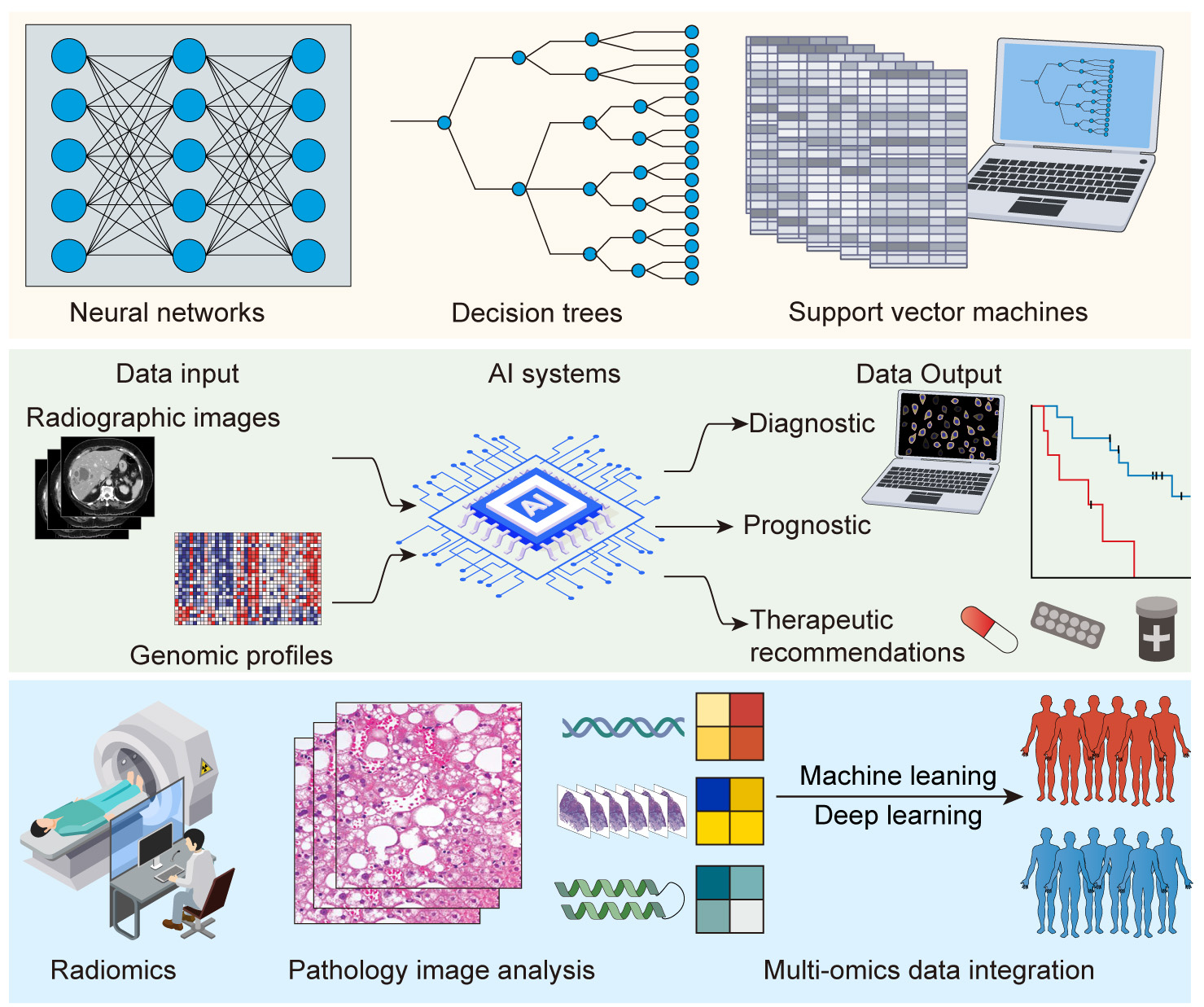 Artificial intelligence (AI) and oncology interface. Upper panel: schematic representation of AI algorithms (e.g., neural networks, decision trees, support vector machines (SVM)). Middle panel: flowchart illustrating the process of data input (e.g., radiographic images, genomic profiles) into AI systems and output (e.g., diagnostic, prognostic, and therapeutic recommendations). Lower panel: examples of AI applications, such as radiomics, pathology image analysis, and multi-omics data integration.