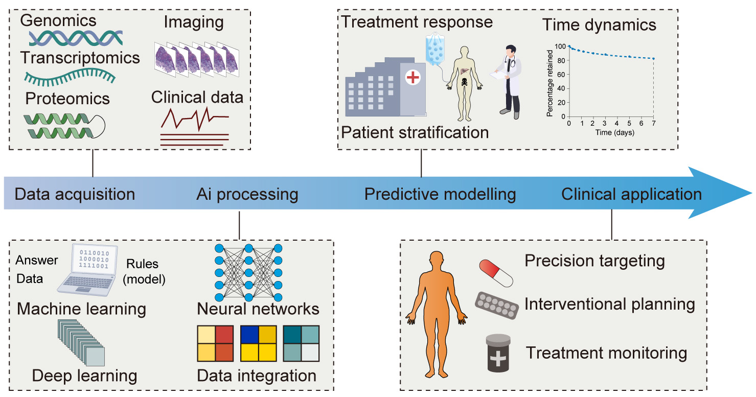 One of the most promising directions for AI is the integration of multi-omics data to inform treatment decisions. The seminal work of Chen and Snyder [86] highlighted the potential use of omics data to obtain a holistic view of the patient’s biology. AI can synthesize information from genomics, transcriptomics, proteomics, and metabolomics to construct comprehensive models of the TME. This multi-faceted approach enables the identification of patient-specific molecular signatures that can predict response to specific interventional therapies.