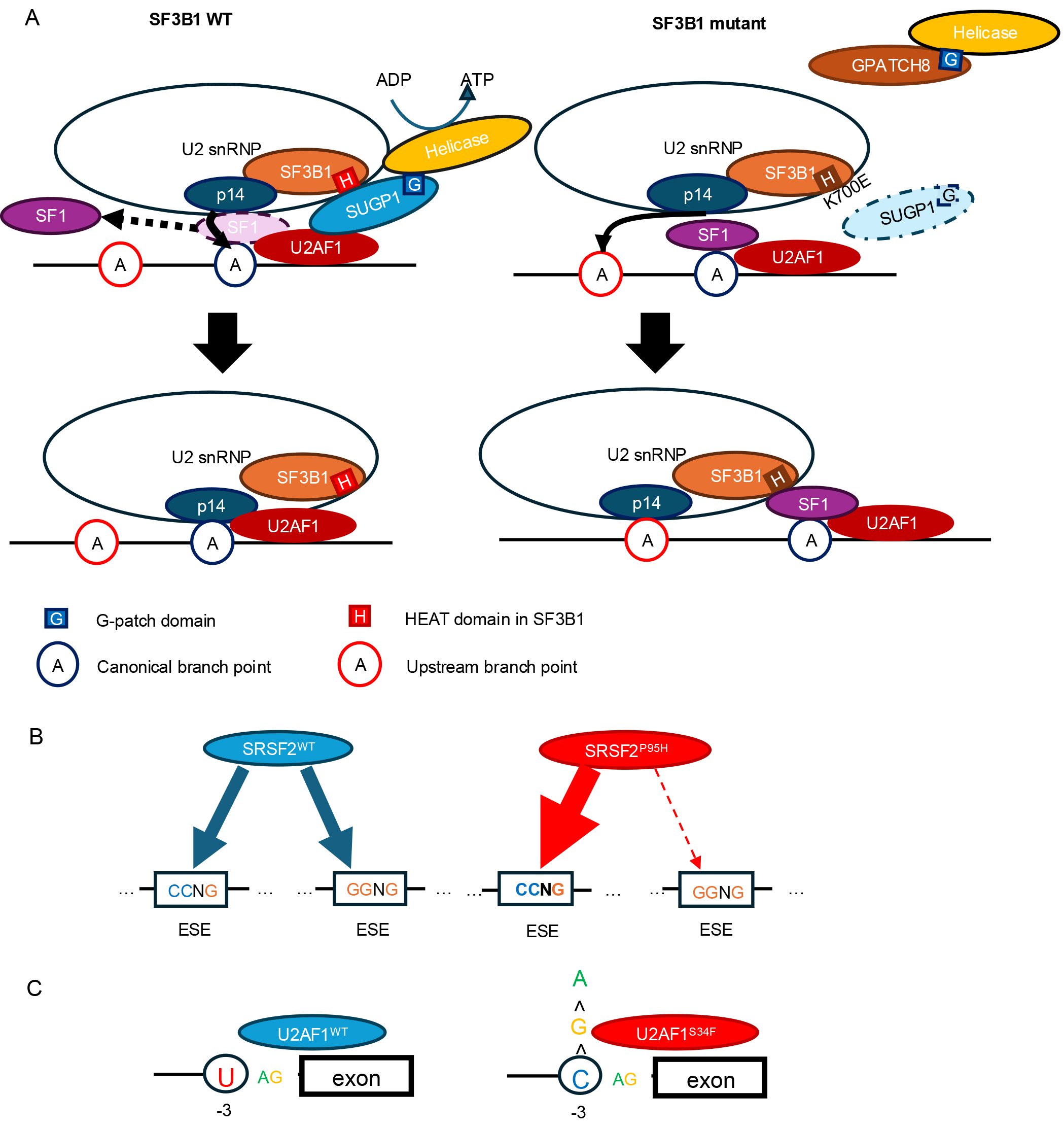Fig. 1. Mechanisms by which major splicing factor mutations alter pre-mRNA splicing. (A) SF3B1K700E impairs recruitment of SUGP1, preventing displacement of SF1 and allowing p14 to recognize an upstream branch point. (B) SRSF2P95H skews the equal recognition of CCNG and GGNG motifs, shifting the preference toward CCNG sequences (ESE, exonic splicing enhancer). (C) U2AF1WT preferentially recognizes the sequences containing U at the –3 position relative to the 3′ splice site, whereas U2AF1S34F shifts this preference toward sequences containing C at the same position. SF, splicing factor.