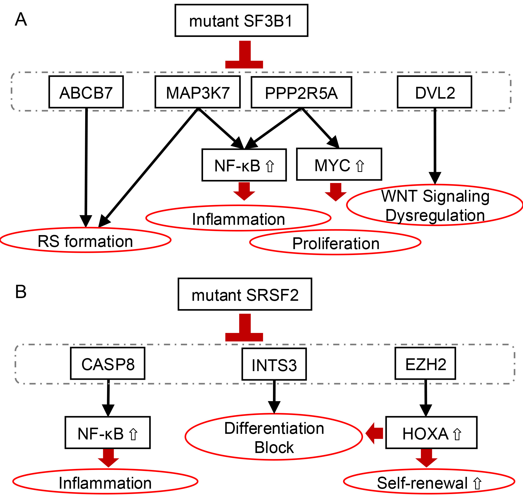 Fig. 2. Oncogenic pathways induced by mutant SF3B1 and SRSF2 in clonal hematopoiesis and myeloid malignancies. (A) Mutant SF3B1 induces aberrant splicing of critical regulatory genes, including ABCB7, MAP3K7, pPP2R5A, DVL2, and RNH1. These alterations lead to enhanced proliferation and inflammation, dysregulation of WNT signaling, and ring sideroblast (RS) formation. (B) Mutant SRSF2 causes mis-splicing and downregulation of CASP8 and EZH2, resulting in enhanced NF-