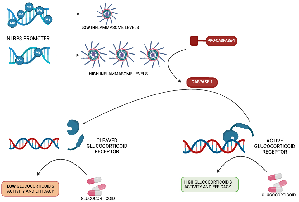NLRP3 methylation as a glucocorticoid response biomaker. Schematic representation of the NLRP3 promoter methylation level as a regulator of glucocorticoid response.