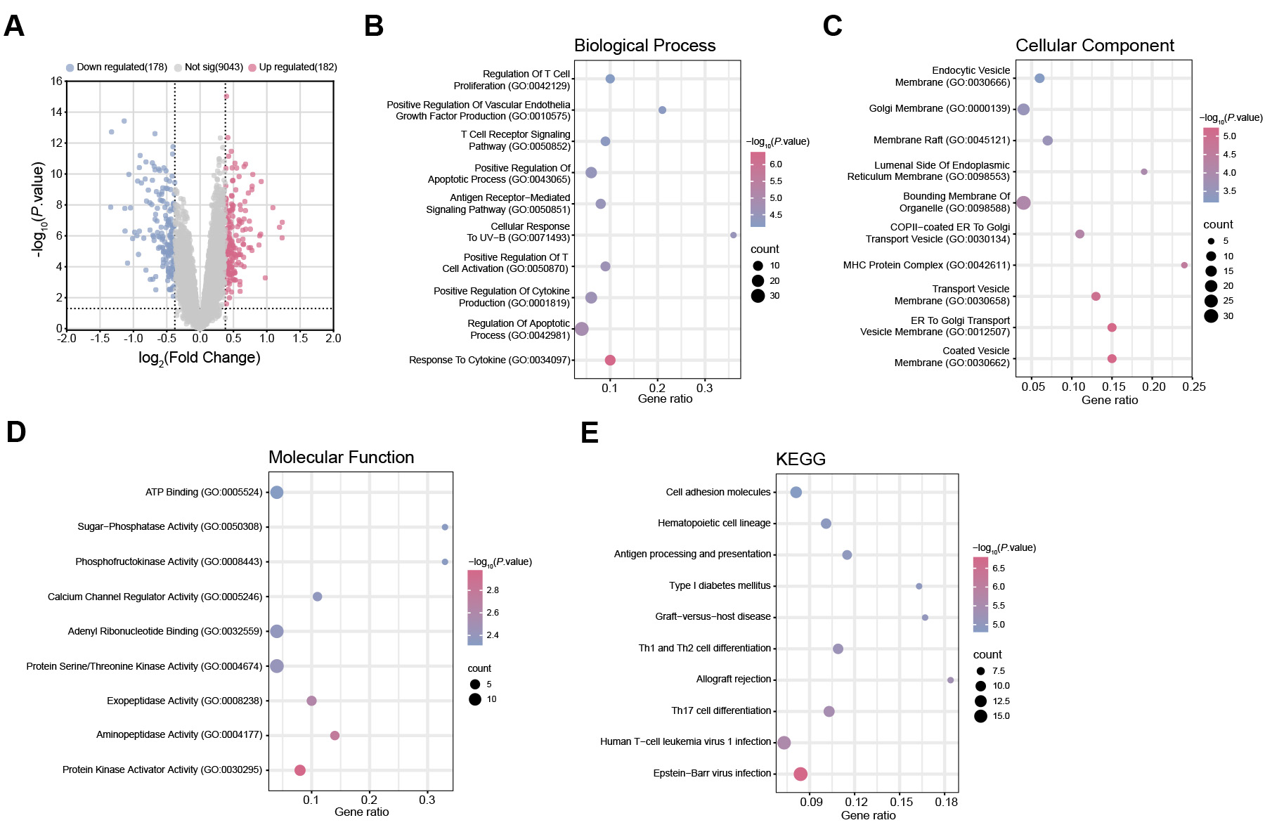 Differential gene expression and functional enrichment analysis. (A) Volcano plot displaying identified DEGs from the GSE89376 dataset. Each point represents an individual gene. Up-regulated DEGs are depicted in pink, and down-regulated DEGs are depicted in blue. (B) GO enrichment analysis of BP terms associated with DEGs. The x-axis represents the GeneRatio, and the y-axis indicates the enriched terms. The size of the dots corresponds to the number of genes, and the color reflects the adjusted p value. (C) GO enrichment analysis of CC terms of DEGs. (D) GO enrichment analysis of MF terms of DEGs. (E) KEGG enrichment analysis predicted the pathways of DEGs involvement. DEGs, Differential Expressed Genes; GO, Gene Ontology; BP, Biological process; CC, Cell component; MF, Molecular function; KEGG, Kyoto Encyclopedia of Genes and Genomes.