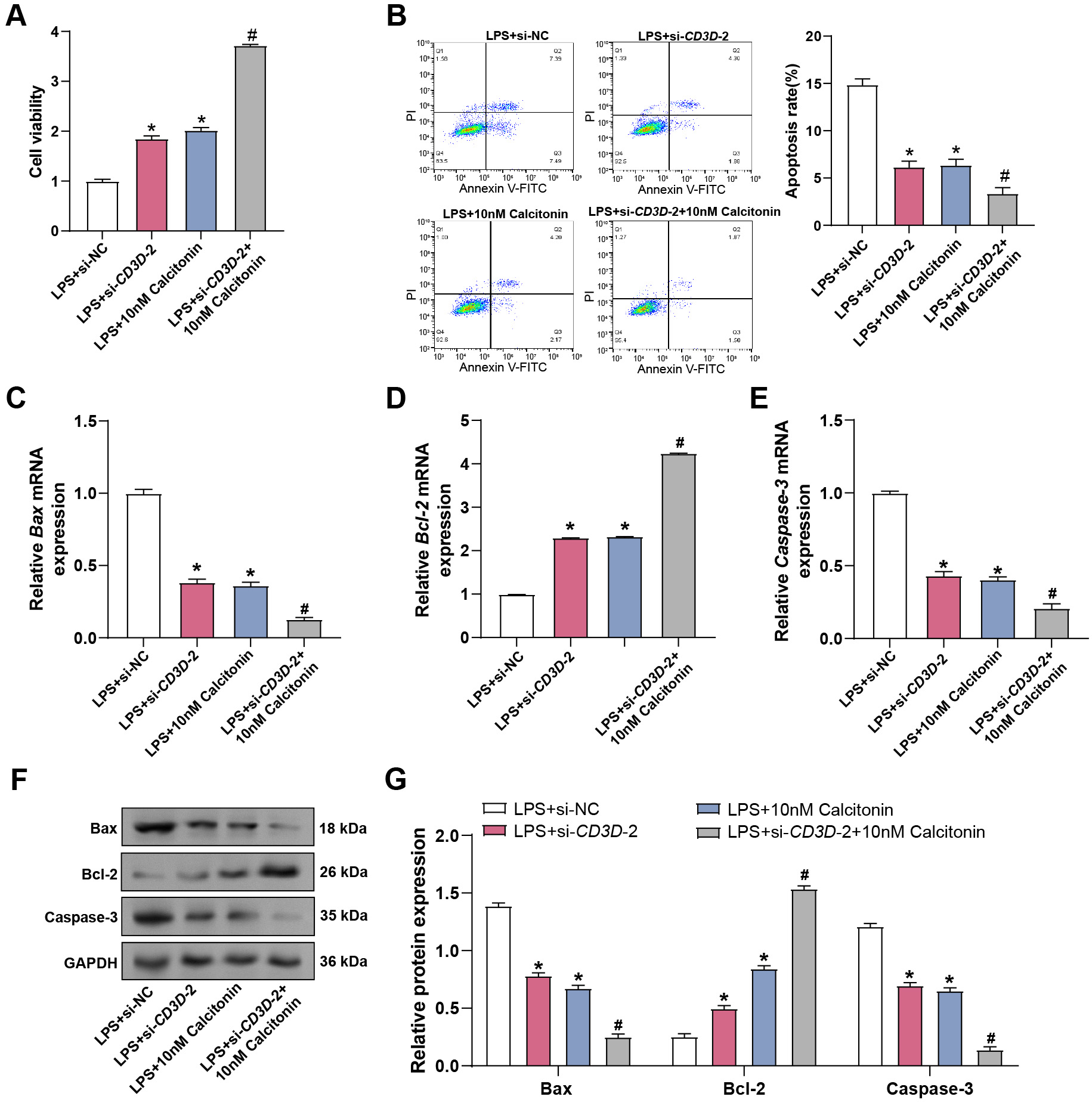 Among the investigated doses, 10 nM calcitonin had the most antioxidative impact and was thus chosen for further investigations. To determine the combined effect of CD3D knockdown and calcitonin, hPMECs were exposed to LPS in the presence or absence of si-CD3D-2 and/or 10 nM calcitonin. CCK-8 assays showed that both CD3D knockdown and calcitonin treatment significantly restored LPS-impaired cell viability, while their combined application further enhanced viability, suggesting a synergistic effect (Fig. 10A). Flow cytometry confirmed that apoptosis was most effectively reduced in the co-treatment group (Fig. 10B). Both qRT-PCR and WB confirmed that combined therapy enhanced Bcl-2 levels while more effectively downregulating Bax and Caspase-3 compared to single-agent treatments (Fig. 10C–G). These data suggest that CD3D depletion and calcitonin act in concert to suppress LPS-triggered apoptosis and enhance endothelial resilience.