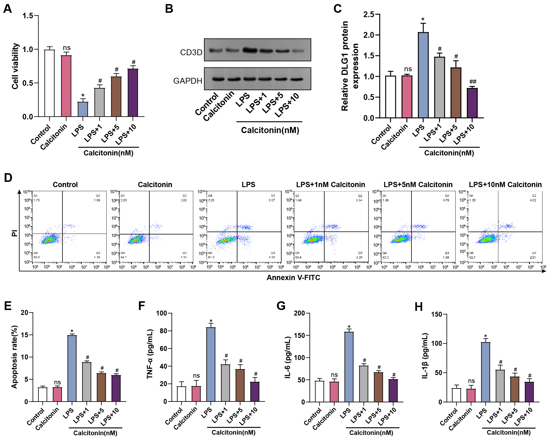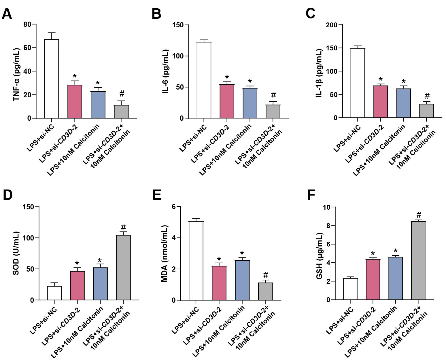 Calcitonin has demonstrated strong anti-inflammatory properties in a range of inflammatory conditions, including sepsis [37]. Its ability to modulate the inflammatory response is critical for reducing tissue damage and improving survival rates in septic models. Baranowsky et al. [14] demonstrated that PCT exerts pro-inflammatory effects in sepsis-induced shock by acting through the CGPR receptor. This mechanism aggravates septic conditions by promoting immune cell production of the inflammatory cytokine IL-17A. In the present study, LPS stimulation of hPMECs exacerbated intracellular oxidative stress, as evidenced by increased MDA and LDH levels, along with reduced activities of the antioxidant enzymes SOD and GSH. Knockdown of the CD3D gene effectively reversed these alterations, thereby alleviating oxidative damage. Moreover, calcitonin exerted a dose-dependent protective effect against LPS-induced cellular injury, progressively restoring cell viability, reducing apoptosis, and significantly inhibiting the release of pro-inflammatory cytokines. Additionally, calcitonin reduced intracellular MDA levels while enhancing SOD and GSH content, collectively mitigating oxidative stress. Moreover, knockdown of CD3D also attenuated LPS-induced cytokine production and oxidative stress, and its combination with calcitonin further potentiated these protective effects, synergistically preserving pulmonary microvascular endothelial cells from injury.