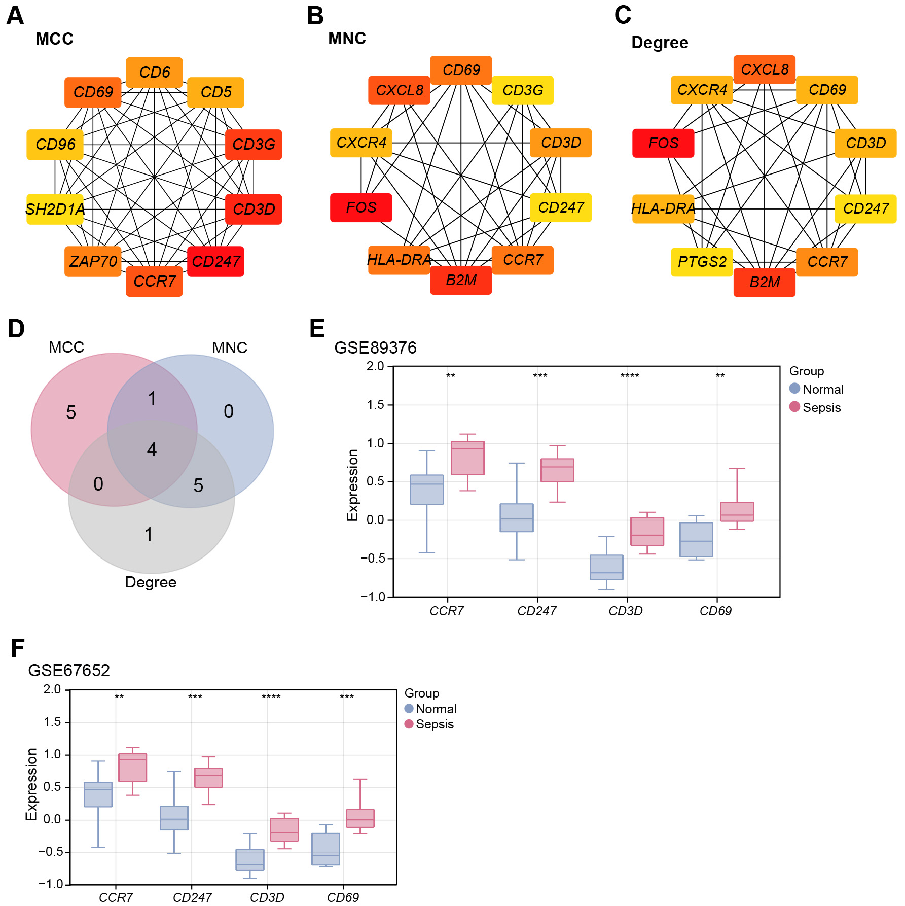 To explore interactions among DEGs, a PPI network was established using the STRING platform (https://string-db.org/). Key modules were identified in Cytoscape (version 3.8.1; Cytoscape Consortium San Diego, CA, USA) via CytoHubba with Degree, Maximum Neighborhood Component (MNC), and Maximal Clique Centrality (MCC) algorithms. Overlapping genes across modules were identified through the Venn analysis tool (https://bioinformatics.psb.ugent.be/webtools/Venn/). Their expression patterns were subsequently validated in the GSE89376 and GSE67652 datasets by comparing septic and control samples. Data analysis and visualization were performed with Sangerbox (http://vip.sangerbox.com/home.html).