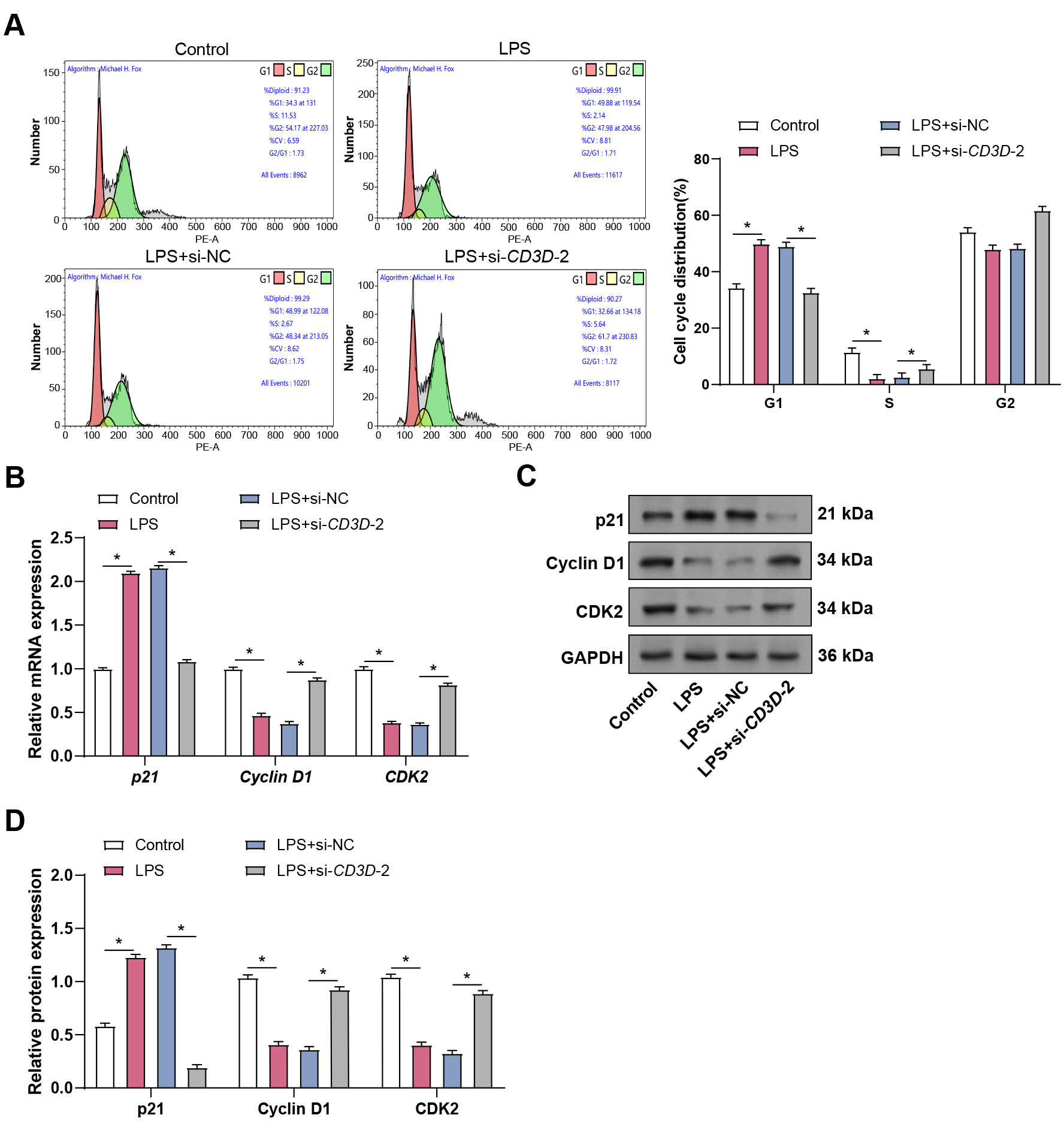 Sepsis can progress to severe infection and complications. Vigilant monitoring and management of organ dysfunction, circulatory failure, and metabolic disturbances are crucial therapeutic measures [23]. In this research, differential expression and functional enrichment analyses of sepsis-related gene datasets were performed, identifying key pathways such as TCR Signaling Pathway, Calcium Channel Regulator Activity, and Endocytic Vesicle Membrane. Our study identified four significantly expressed genes (CCR7, CD247, CD3D, and CD69) through PPI network analysis. Notably, Liang et al. [24] reported that CCR7 and CD3D were closely linked to sepsis. Furthermore, Jiang et al. [25] found reduced expression of FYN and CD247 in septic shock, connecting them to impaired immune responses and decreased T-cell activity. At the same time, Goswami et al. [26] identified CD69 and CD64 as upregulated markers for rapid sepsis detection. In this study, CD3D was identified as the most significantly differentially expressed gene across two independent sepsis-related datasets. In vitro experiments revealed that LPS stimulation markedly upregulated CD3D expression in hPMECs. LPS exposure induced G1 phase cell cycle arrest, whereas CD3D knockdown partially reversed this effect by downregulating p21 and restoring the expression of Cyclin D1 and CDK2, thereby facilitating cell cycle progression.