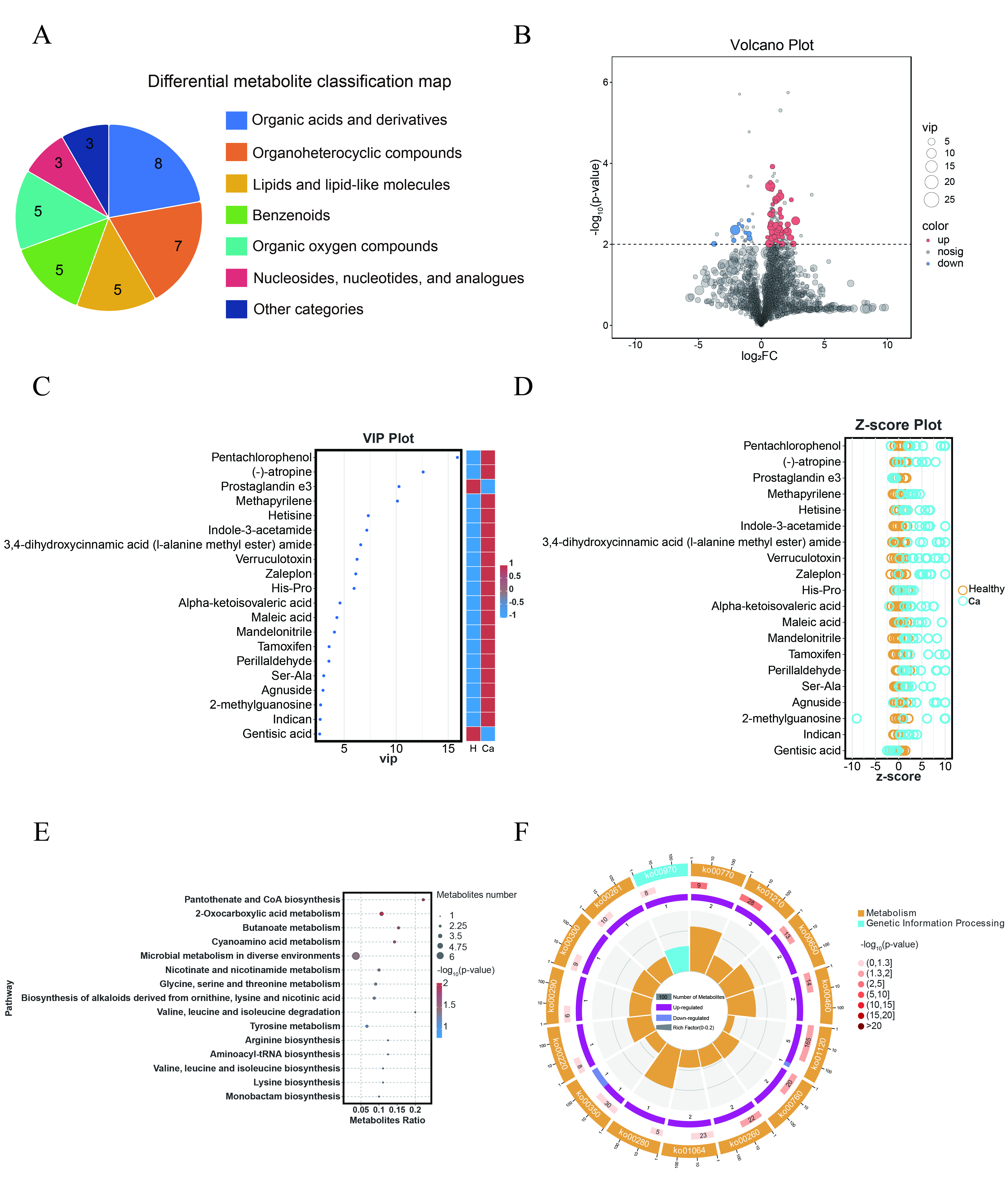 Differential metabolites in urine between different groups exhibit distinct characteristics. (A) Classification map of differential metabolites. (B) Volcano plot of differential metabolites. (C) VIP plot of differential metabolites. (D) Z-score plot of differential metabolites. (E) KEGG enrichment bubble plot of differential metabolites. The size of the circle represents the number of differential metabolites enriched in each pathway. (F) Metabolic pathway circle plot. VIP, variable importance in the projection; KEGG, Kyoto Encyclopedia of Genes and Genomes.
