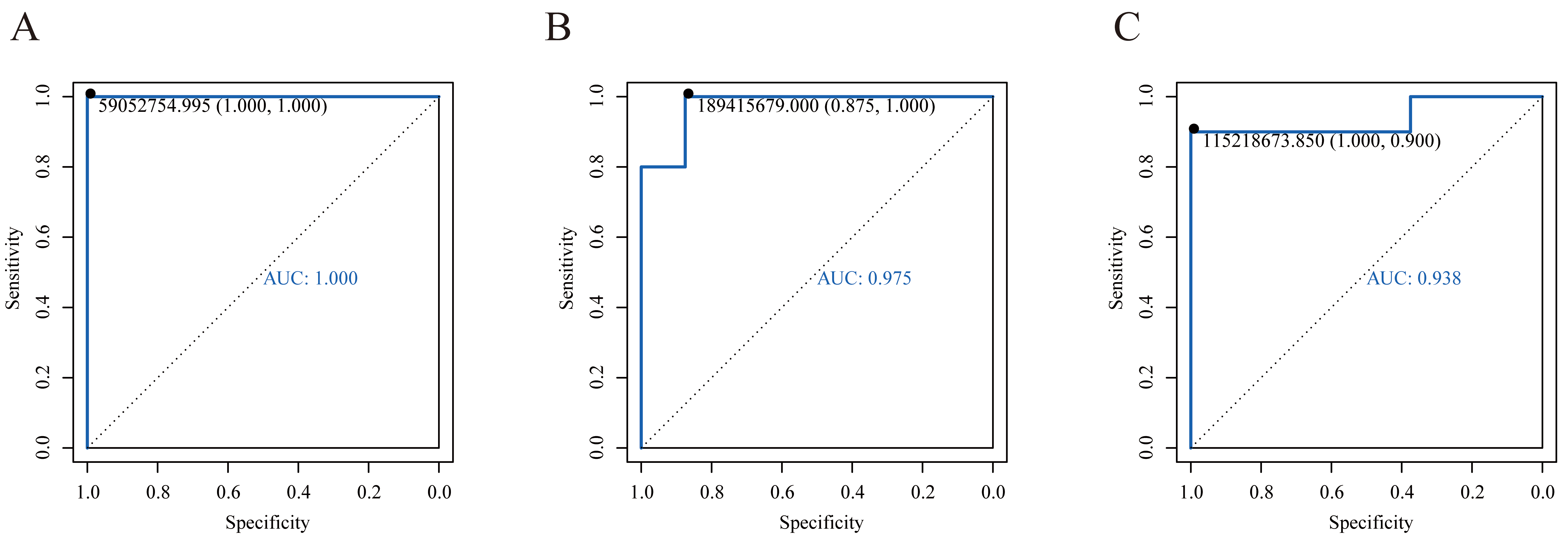 ROC curves of potential biomarkers. (A) ROC curve of Suberic acid. (B) ROC curve of 2′-O-methylcytidine. (C) ROC curve of 3′-Sialyllactose. ROC, receiver operating characteristic.