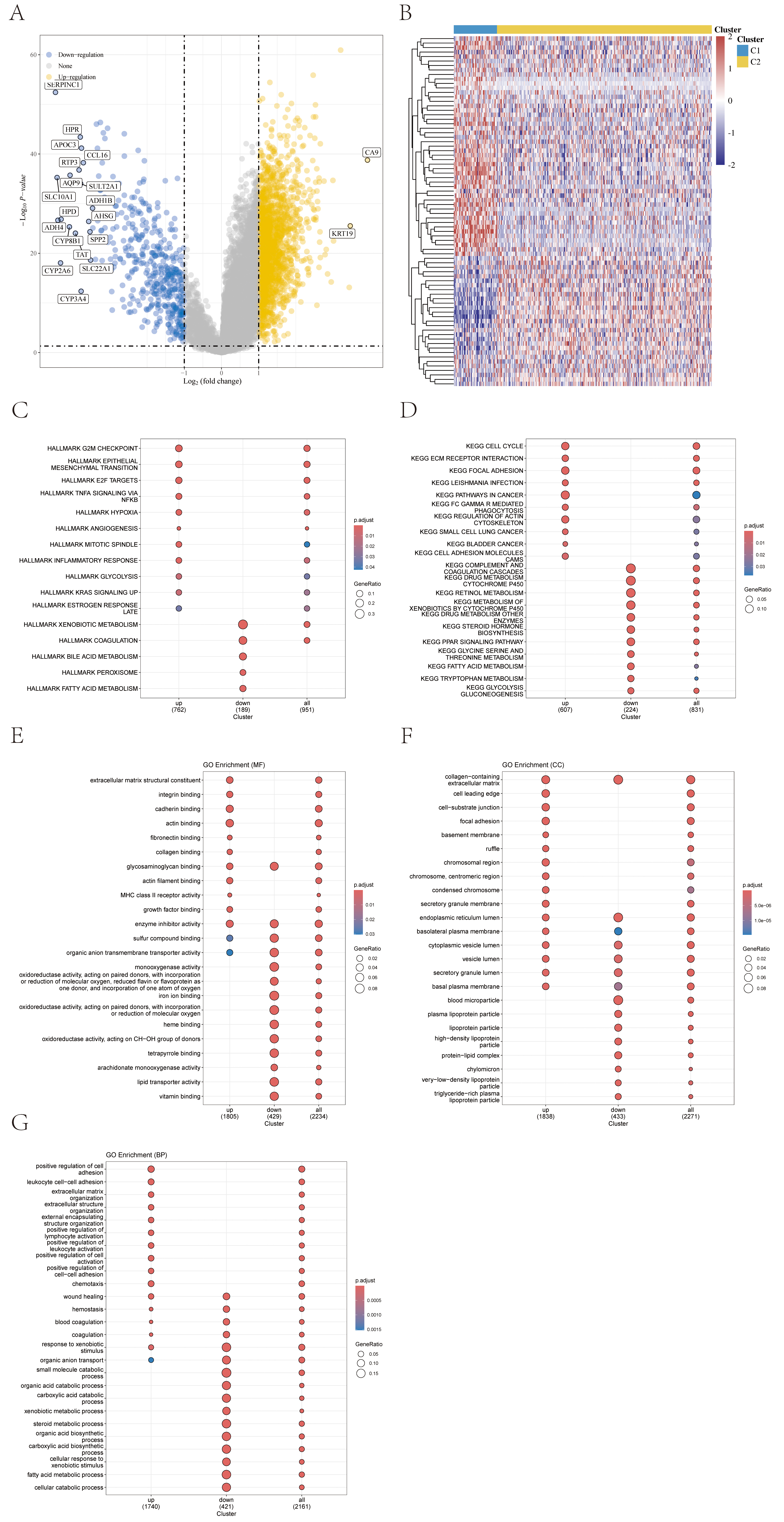 Analysis of gene expression differences between molecular subtypes. (A) Volcano plot of differentially expressed genes between C1 and C2 subtypes. (B) Clustering heatmap of differential metabolites. (C–G) Hallmark, KEGG, GO gene enrichment dotplot. KEGG, Kyoto Encyclopedia of Genes and Genomes; GO, Gene Ontology.