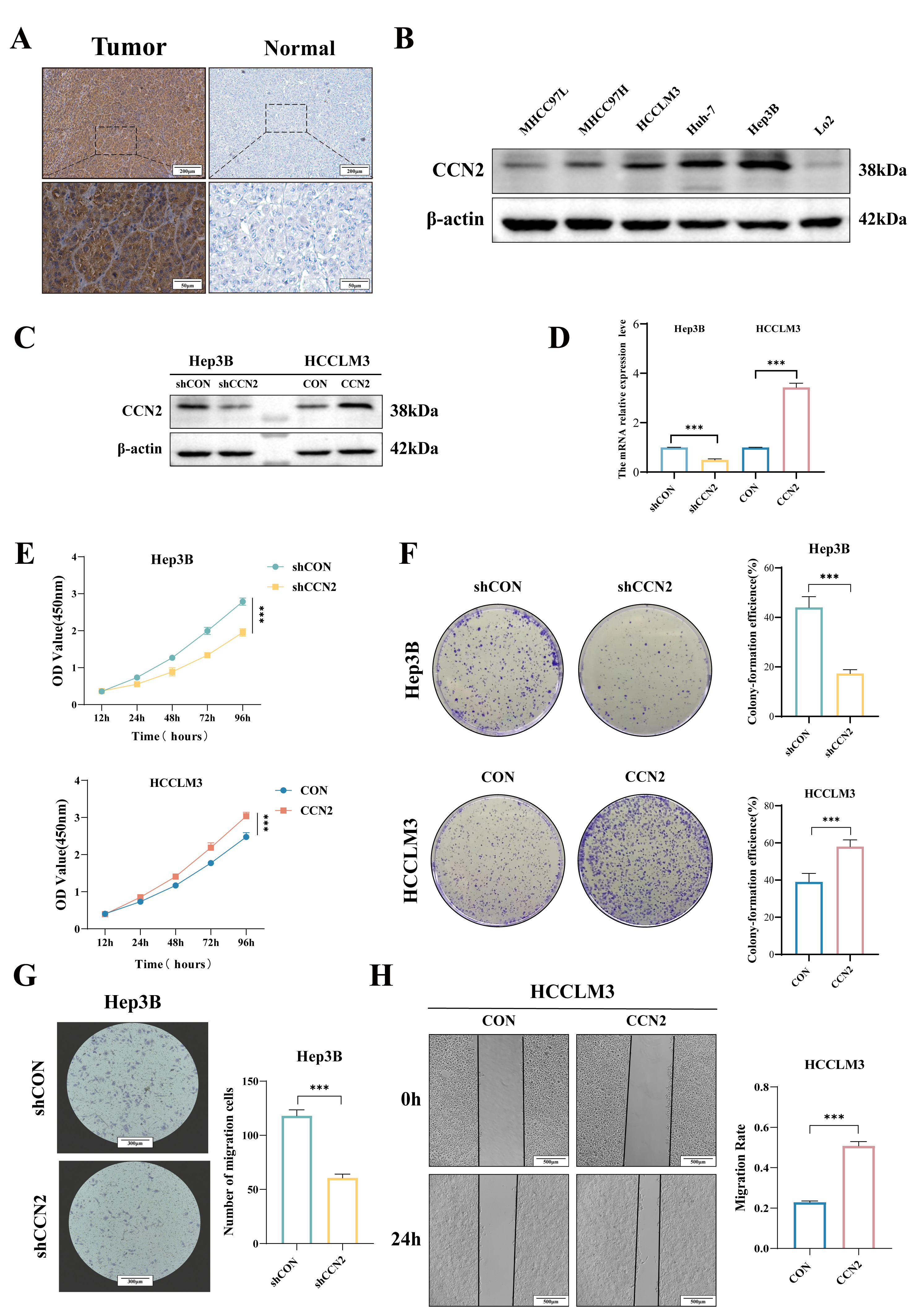 Cell lines including MHCC97L, MHCC97H, HCCLM3, Hep3B, Huh-7, and LO2 were all kindly provided by the Liver Disease Research Institute affiliated with Fudan University in Shanghai. These cells were cultured in Dulbecco’s modified Eagle medium (DMEM, 2329225, VivaCell, Shanghai, China) supplemented with 10% fetal bovine serum (FSP500, ExCell Bio, Shanghai, China) and 1% penicillin-streptomycin (P1400, Solarbio, Beijing, China). All cells were maintained at 37 °C with 5% CO2. All cell lines used in this study were authenticated by short tandem repeat (STR) profiling and confirmed to be mycoplasma-negative. Lentiviruses for CCN2 overexpression and knockdown were purchased from Beijing Tsingke Biotech Co., Ltd. (China). Lentiviral transfections were conducted according to the manufacturer’s instructions, with Lipo3000 (L3000015, Invitrogen, Carlsbad, CA, USA) used as recommended. Screening was performed using puromycin (P8230, Solarbio, Beijing, China).