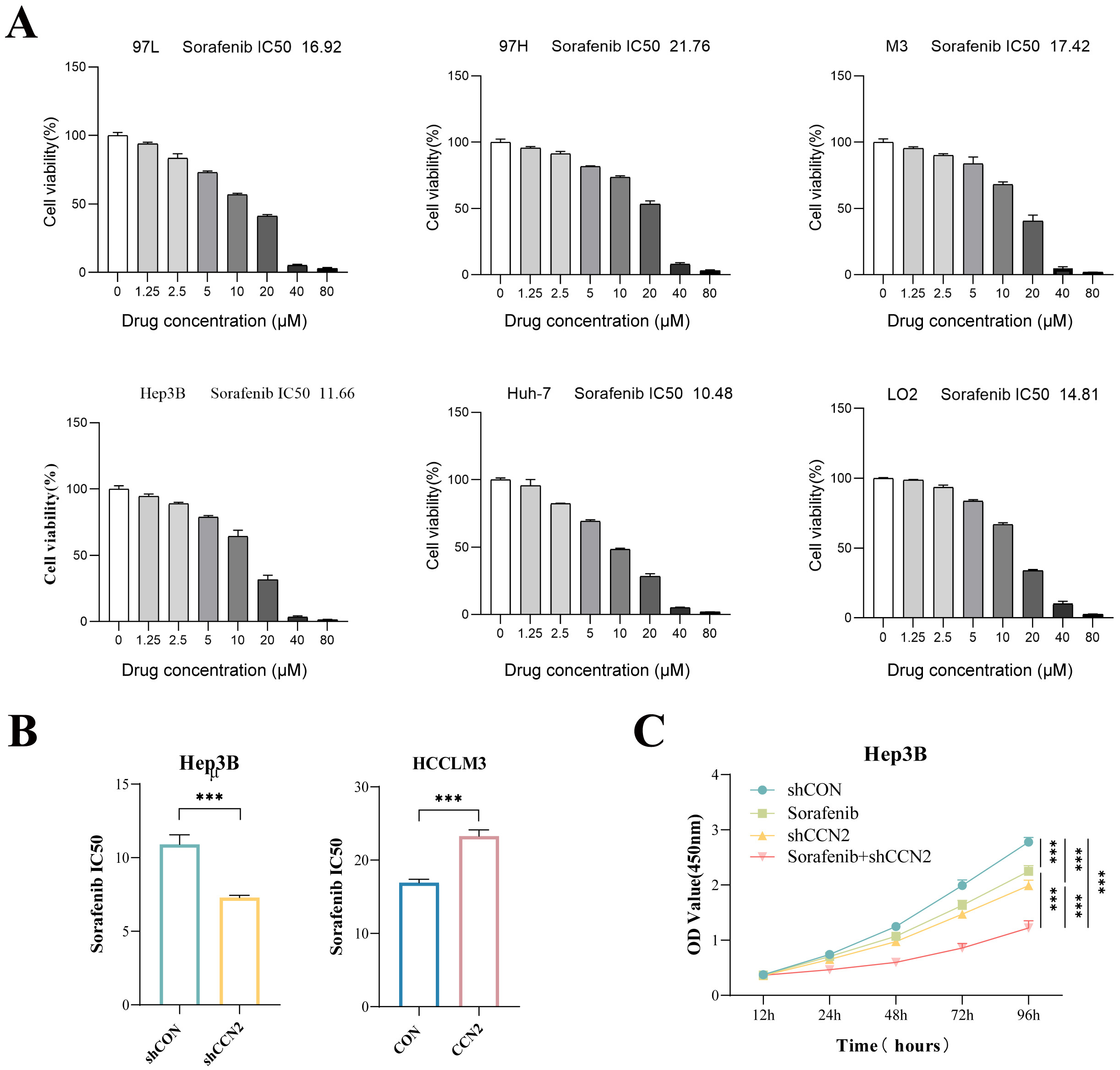 Cells were seeded into 96-well plates at a density of 5000 cells per well and incubated. Once the cells adhered, varying concentrations of Sorafenib (0 µM, 1.25 µM, 2.5 µM, 5 µM, 10 µM, 20 µM, 40 µM, and 80 µM) were added according to the experimental groups. Upon further incubation for 24 h, CCK-8 solution was added, the absorbance at 450 nm was measured, and cell viability was calculated.