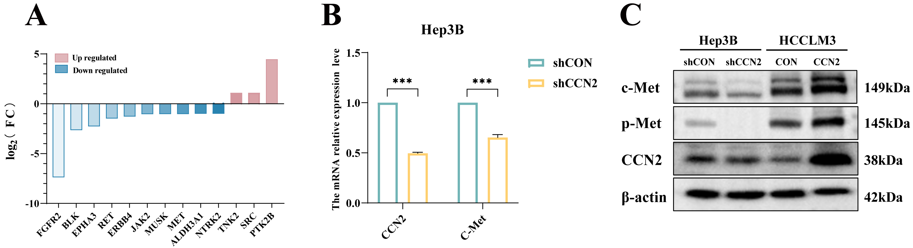 Sorafenib, the first FDA-approved multi-targeted tyrosine kinase inhibitor for advanced hepatocellular carcinoma, inhibits tumor growth primarily by suppressing angiogenesis. To identify potential mediators of resistance, a tyrosine kinase PCR array profiling 90 tyrosine kinases (60 receptor and 30 non-receptor types) was used in CCN2-knockdown Hep3B cells. This screen revealed a broad downregulation of tyrosine kinase mRNAs, most notably c-Met (Fig. 3A). Subsequent validation by RT-qPCR and Western blot confirmed that CCN2 knockdown specifically reduces c-Met expression at both the mRNA and protein levels (Fig. 3B,C). These findings indicate that CCN2 promotes sorafenib resistance in HCC cells, at least in part, through the activation of c-Met.