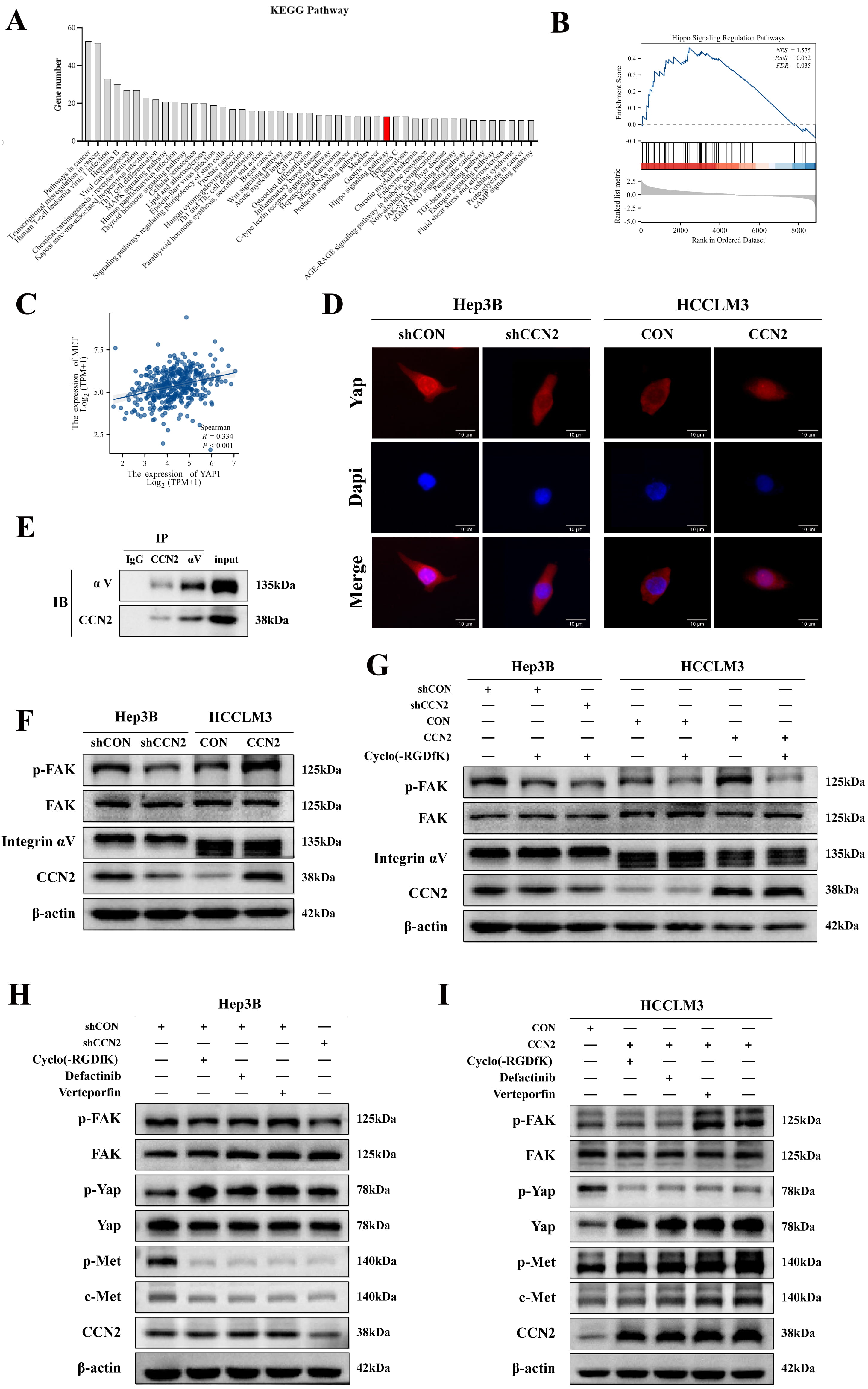 RNA-seq data for HCC were obtained from The Cancer Genome Atlas (TCGA) database (https://portal.gdc.cancer.gov/). Based on the median expression level of CCN2, HCC patients were categorized into high-expression (n = 187) and low-expression (n = 187) groups, and differentially expressed genes between these two groups were identified. The resulting CCN2-associated differentially expressed genes were subsequently analyzed and functionally enriched using the GSEA platform (https://www.gsea-msigdb.org/gsea/index.jsp). Transcription factors potentially regulating the c-Met gene were predicted via the humanTFDB database. Finally, Kyoto Encyclopedia of Genes and Genomes (KEGG) pathway enrichment analysis was conducted on these c-Met-related transcription factors using The Database for Annotation, Visualization and Integrated Discovery (DAVID) database (https://davidbioinformatics.nih.gov/summary.jsp). The correlation between Met and Yap expression was analyzed using the Gene Expression Profiling Interactive Analysis (GEPIA) database (http://gepia.cancer-pku.cn/).