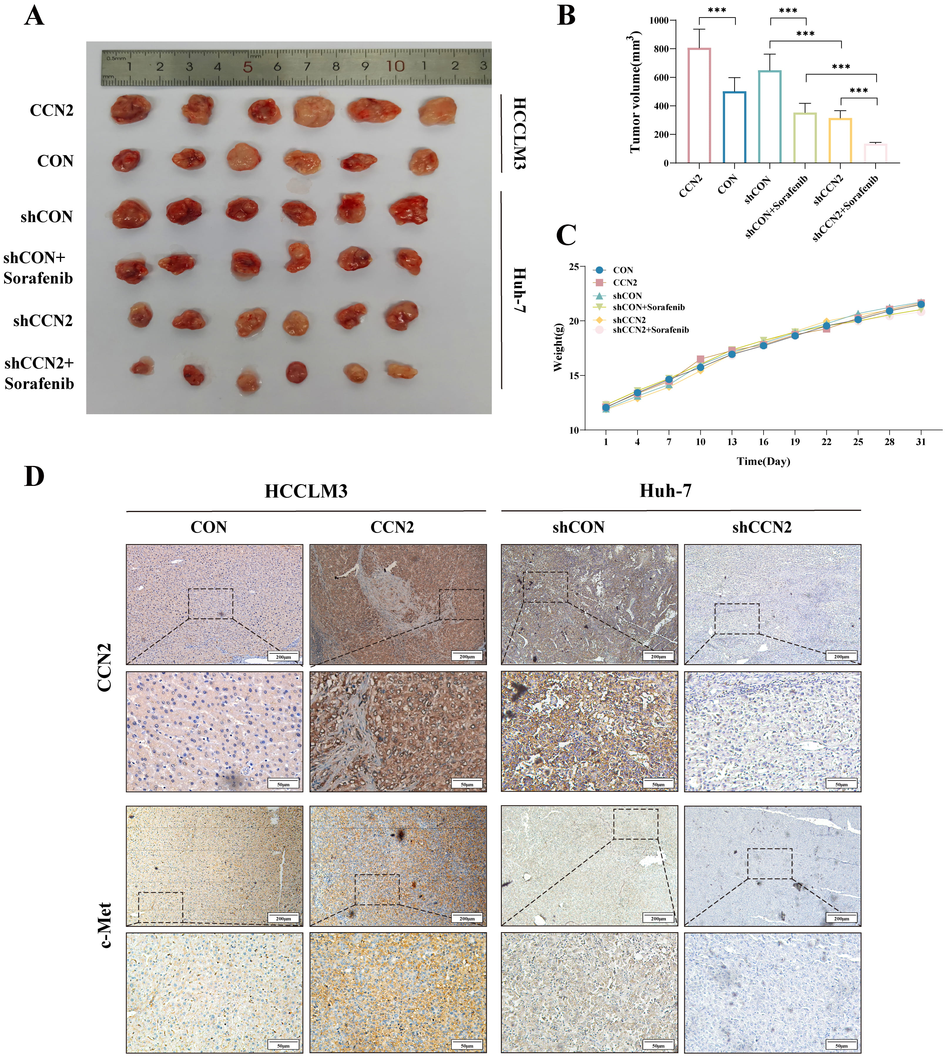 To investigate the role of CCN2 in promoting tumor growth in vivo and conferring resistance to sorafenib, Huh-7 cells with either control or CCN2 knockdown (assigned to shCON, shCCN2, shCON + Sorafenib, and shCCN2 + Sorafenib groups), as well as HCCLM3 cells with control or CCN2 overexpression (designated as control and CCN2 groups), were subcutaneously injected into the left anterior axilla of female BALB/c nude mice to generate xenograft tumor models (n = 6 per group). Mice in the Sorafenib and shCCN2 + Sorafenib groups were administered 25 mg/kg sorafenib via intraperitoneal injection every three days, while control groups received an equivalent volume of saline. Tumor growth was monitored tri-weekly. Following a 30-day period, the mice were euthanized, and the tumors were excised for volume and weight measurement (Fig. 5A–C). The results showed that tumors in the CCN2-overexpressing group were significantly larger than those in the control group (806.87 mm3 vs. 502.49 mm3). Critically, the shCCN2 + Sorafenib combination group exhibited the smallest tumor volume (135.10 mm3), which was substantially reduced compared to the shCON (649.33 mm3), Sorafenib-alone (353.59 mm3), and shCCN2-alone (315.29 mm3) groups (Fig. 5A,B). Corroborating this functional data, immunohistochemical analysis confirmed the involvement of the c-Met pathway: c-Met expression was significantly lower in the shCCN2 group than in the shCON group, and higher in the CCN2-overexpressing group compared to its control (Fig. 5D). Collectively, these findings indicate that CCN2 interference alleviates c-Met-mediated sorafenib resistance, and that combining sorafenib with CCN2 targeting enhances its antitumor efficacy.