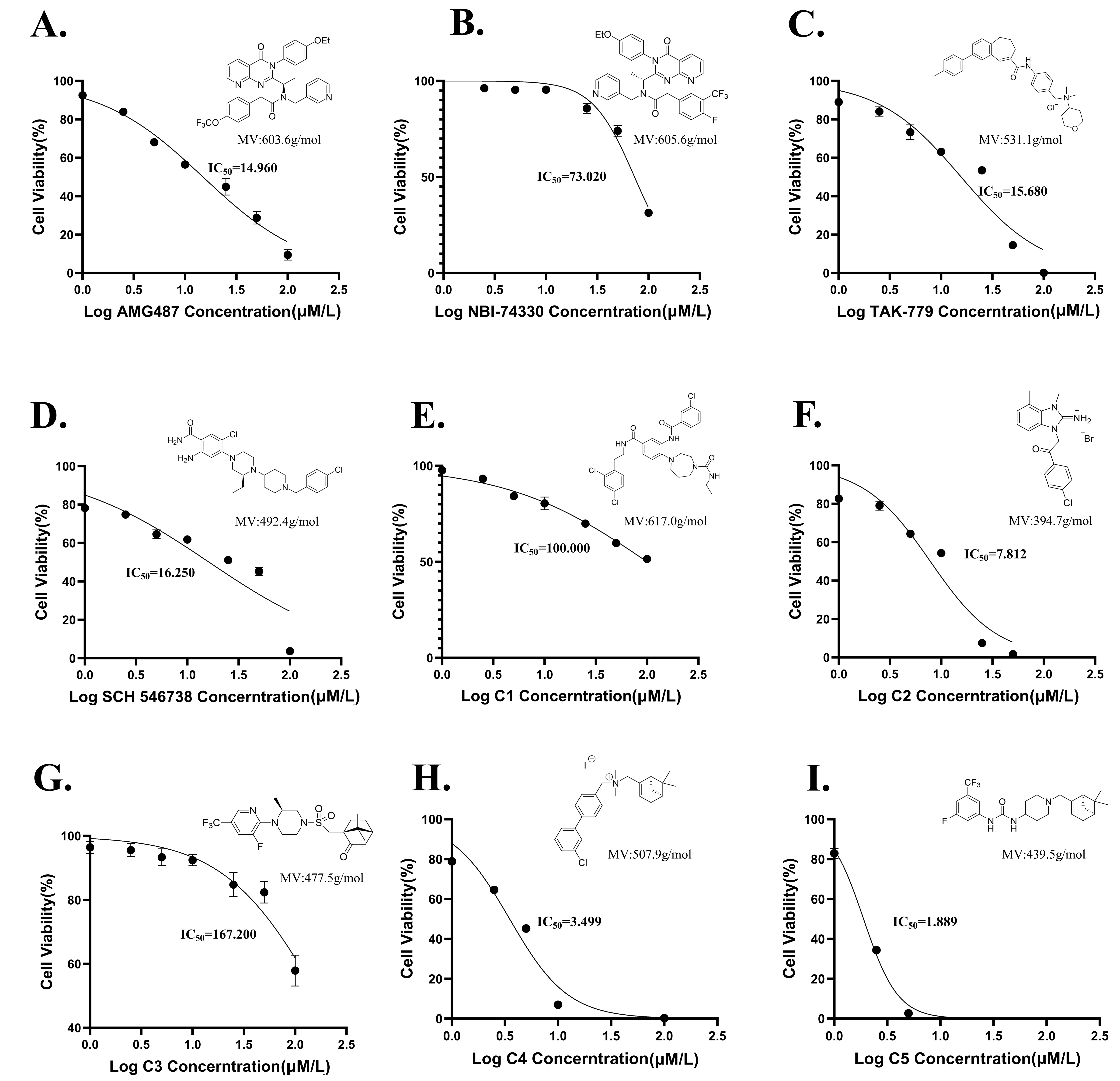 Chemokines are a class of small molecular proteins primarily responsible for regulating the migration and activation of immune cells. They play significant roles in both innate and adaptive immunity and are involved in processes such as inflammatory responses, immune surveillance, tissue development and repair [34]. The chemokine receptor CXCR3 and certain selective CXCR3 antagonists exhibit varying effects under inflammatory conditions. In lung tissues of pigs infected with Porcine Reproductive and Respiratory Syndrome Virus (PRRSV), the expression levels of CXCL10 and CXCR3 are elevated. Treatment with the CXCR3 antagonist AMG 487 results in reduced infiltration of inflammatory cells in the alveoli and alleviates lung injury [7]. CXCL10 enhances the mRNA expression of efferocytosis-related molecules, including GAS6, MFGE8, PROS, and Axl, in macrophages. Conversely, the CXCR3 antagonist AMG 487 suppresses the expression of these efferocytosis-related molecules [35]. In RAW264.7 cells treated with Poly(I:C), CXCL10 induces M1-type polarization, whereas AMG 487 promotes M2-type polarization [19]. Despite the discovery of multiple CXCR3 antagonists, there are few clinical trials focusing on these agents. Currently, only the small molecule antagonist AMG 487 has advanced to Phase II clinical trials, although its efficacy remains suboptimal. Various types of CXCR3 antagonists have demonstrated therapeutic effects in animal models of inflammatory diseases. The half-maximal inhibitory concentration (IC50) reflects a drug’s inhibitory capability against a specific target or cell type, with lower values indicating stronger inhibitory potency [36]. The varying IC50 values of different antagonists on the same cell primarily highlight the differences in their efficacy. These discrepancies arise from multiple factors, including the distinct mechanisms of action of the antagonists, cellular resistance mechanisms, and the influence of experimental conditions [37, 38]. By comparing the IC50 values of various antagonists, more potent drugs can be identified. This comparison of different antagonists’ activities allows for the exploration of their structure-activity relationships, which is essential for optimizing drug design and guiding subsequent chemical modifications. Furthermore, different experimental systems may exhibit varying responses to antagonists; thus, screening a diverse range of antagonists enables the selection of the most suitable compound for a specific system, thereby enhancing the reliability and reproducibility of experiments. In this study, we selected nine CXCR3 antagonist, AMG 487, NBI-74330, TAK-779, SCH 546738, C1, C2, C3, C4, and C5, based on prior findings and relevant literature to comparatively investigate their regulatory effects on macrophage function and their roles in ALI. The selection of various antagonists for the experiments aimed to comprehensively evaluate the biological functions of the CXCR3 target and identify the most effective CXCR3 antagonist. The CCK-8 assay demonstrated that the nine antagonists inhibited the growth of RAW264.7 cells in a dose-dependent manner, exhibiting varying IC50 values.