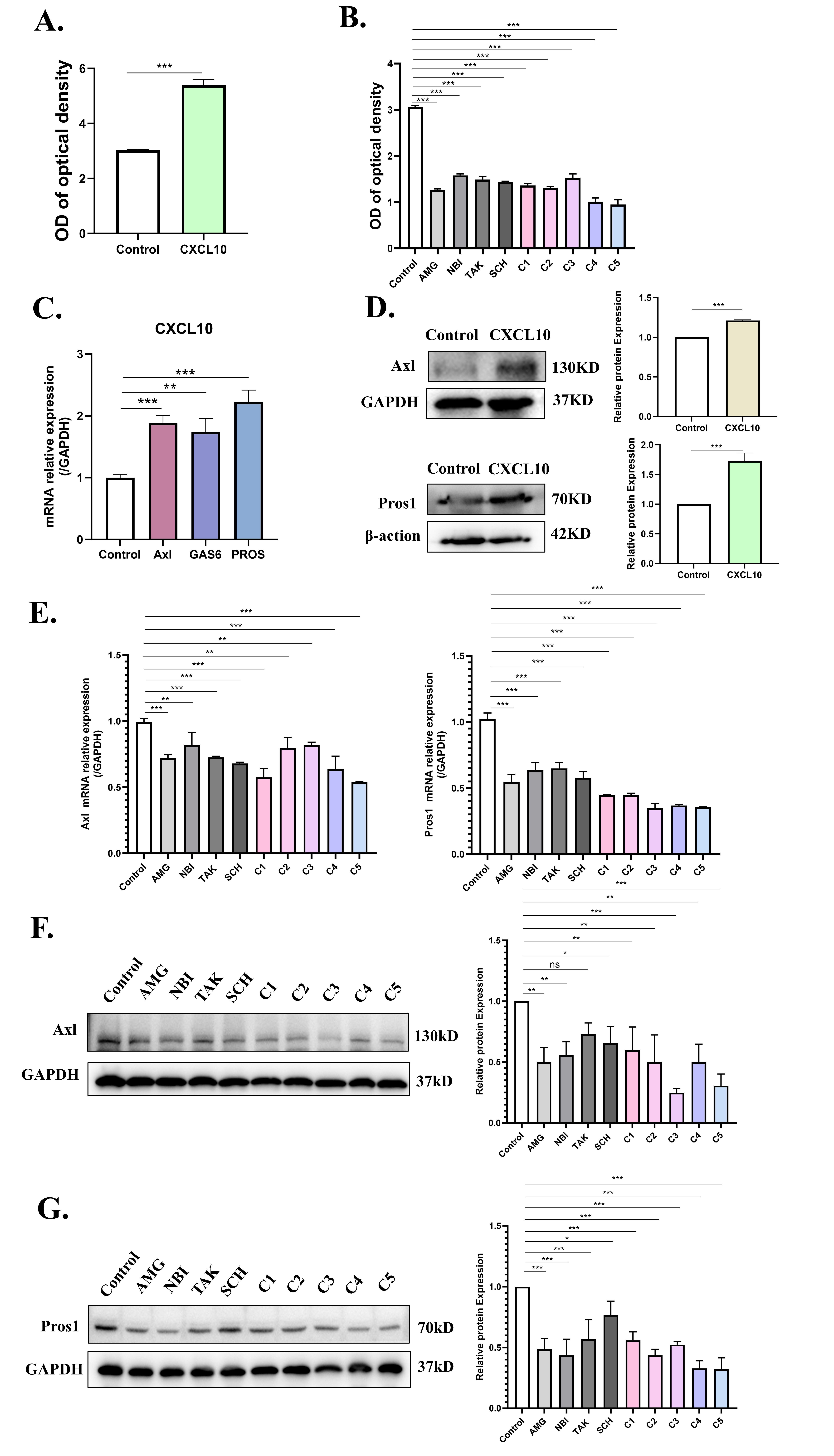 Macrophages play a crucial role in various inflammatory and autoimmune diseases through both innate and adaptive immunity [15]. An imbalance between the activation and suppression of M1 and M2 macrophage phenotypes has been linked to the pathogenesis of numerous diseases [16]. CXCL10 is essential for macrophage recognition of inflammation. During the early stages of inflammation, CXCR3+ macrophages are recruited to the site of injury by the chemotactic effects of CXCL10, thereby inducing local inflammatory responses. CXCL10 facilitates macrophage migration via the extracellular signal-regulated kinase (ERK) and P38/mitogen-activated protein kinase (P38/MAPK) signaling pathways. The activation of the CXCL10-CXCR3 axis triggers intracellular signaling pathways, including Janus kinase (JAK) and signal transducer and activator of transcription 1 (STAT1), which promote M1 polarization of macrophages and induce inflammatory responses in lung tissue. Inhibition of CXCL10 or CXCR3 secretion can reduce the M1/M2 macrophage ratio and decrease the secretion of inflammatory factors, thereby exerting anti-inflammatory effects [17]. Regardless of whether macrophages are tissue-resident or inflammatory, the same stimulus can elicit distinct responses [18]. The regulation of macrophage polarization by the CXCL10-CXCR3 axis is contingent upon the inflammatory state of the macrophages. In cultured RAW264.7 cells, CXCL10 promotes M2 polarization, whereas the CXCR3 antagonist AMG 487 induces M1 polarization. Conversely, in RAW264.7 cells treated with Poly(I:C), a reagent that simulates viral infection, CXCL10 and AMG 487 induce M1 and M2 polarization, respectively [19]. Previous study has demonstrated that the CXCR3-CXCL10 axis plays a critical regulatory role in both the phagocytic function and polarization of macrophages [20]. CXCL10 enhances the efferocytosis capability of macrophages, while AMG 487 inhibits this function by blocking CXCR3 signaling.