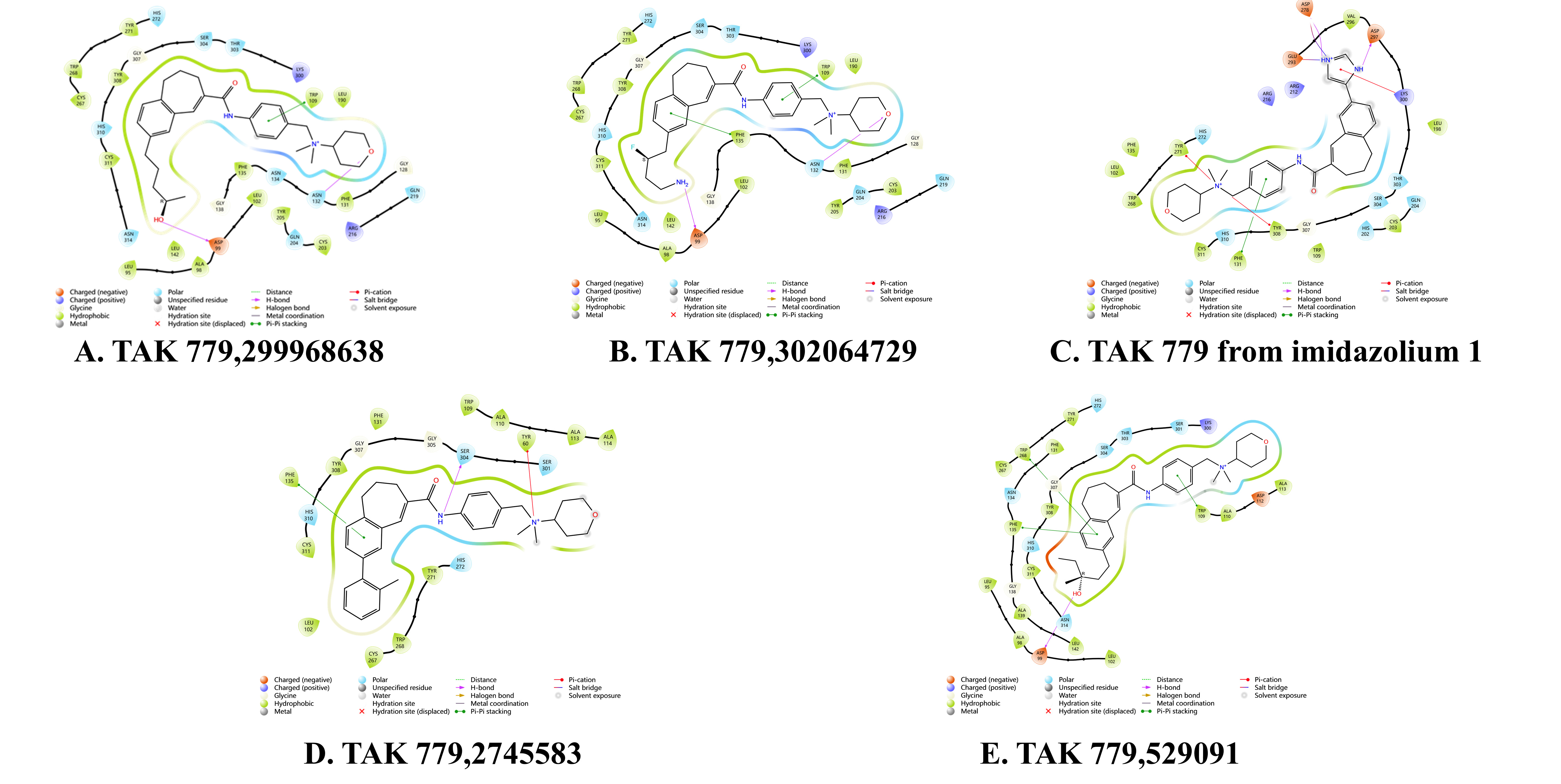 Binding mode of CXCR3 protein and five TAK-779 modifiers. (A) TAK-779,299968638. (B) TAK-779,302064729. (C) TAK-779 from imidazolium 1. (D) TAK-779,2745583. (E) TAK-779,529091.