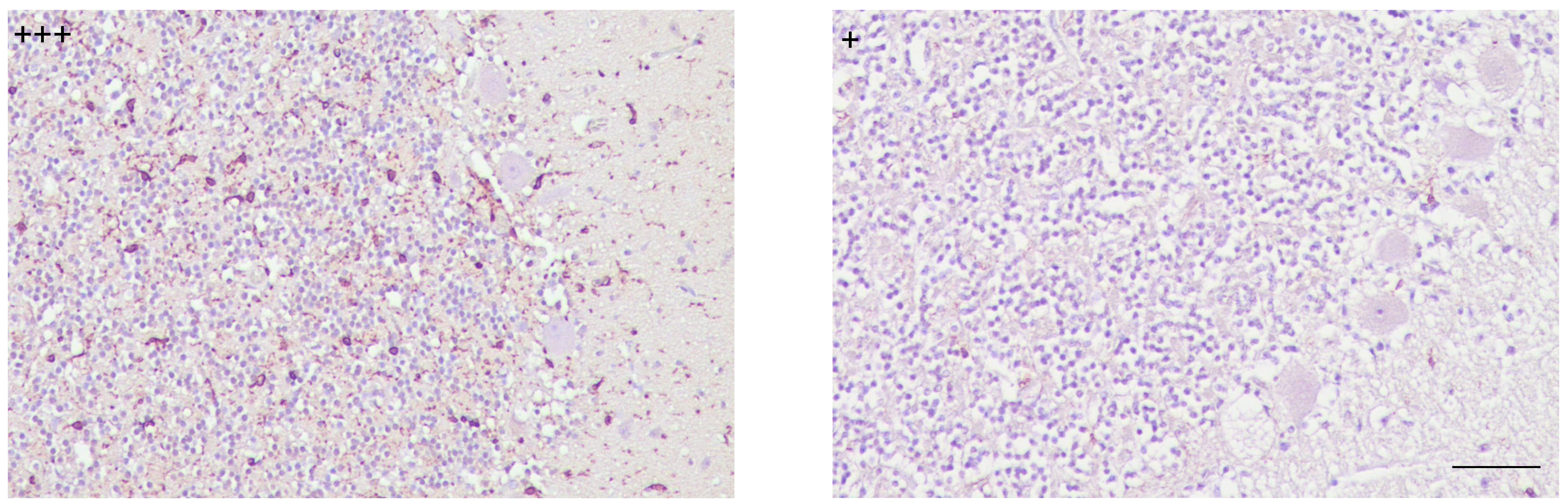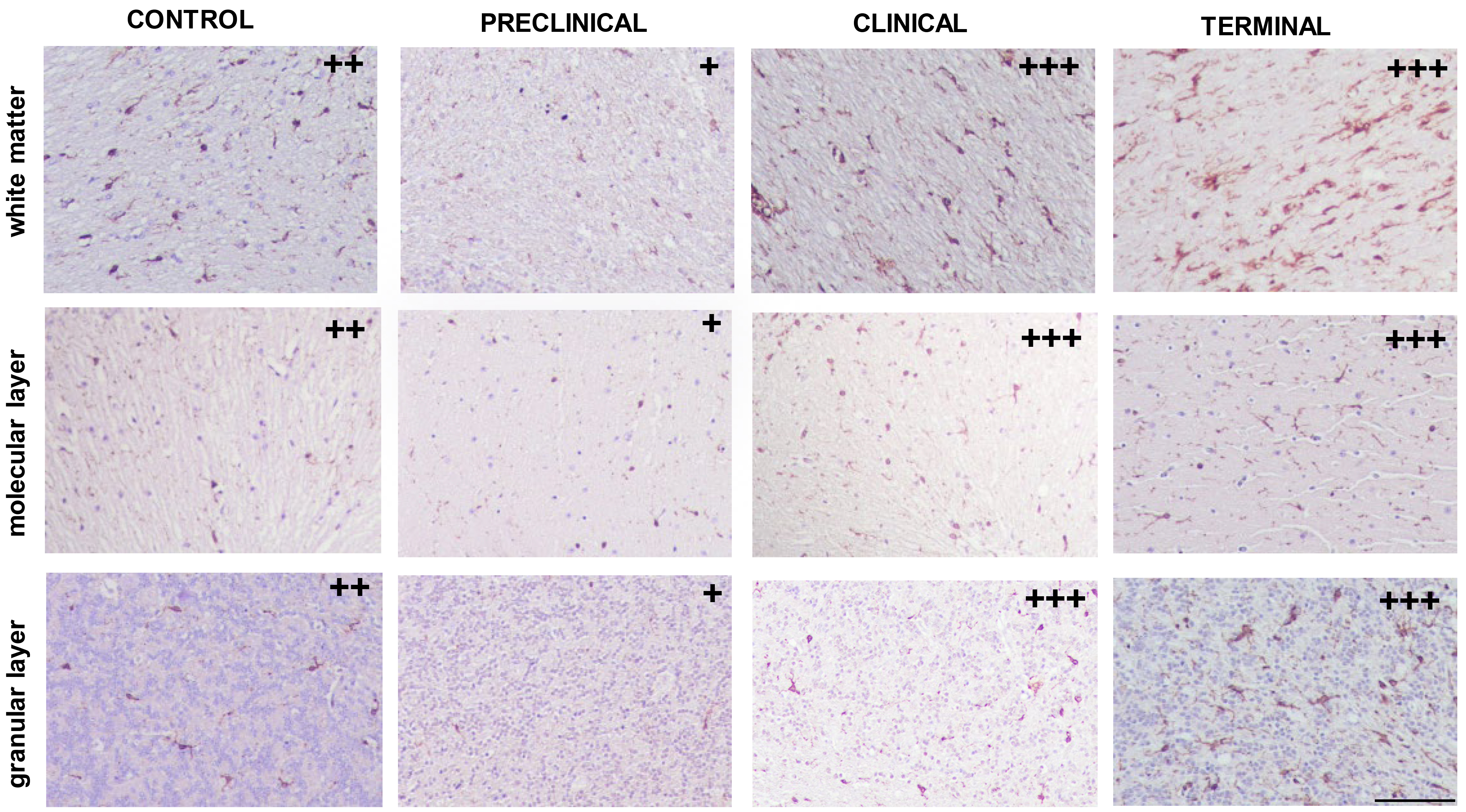 Marker immunostaining was scored from negative (–) to maximum (++++), by evaluating the density and the extent of the labeled deposits in each layer from each cerebellum. The immunostaining morphologies of each marker were also assessed for reactive microglia.