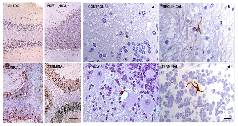 Immunohistochemical profiles confirmed that the abundance and morphology of the cells were found irrespective of the stage of the disease. Only an evident association of dystrophic pattern with advanced stages of the neurodegenerative process of scrapie was consistently demonstrated.