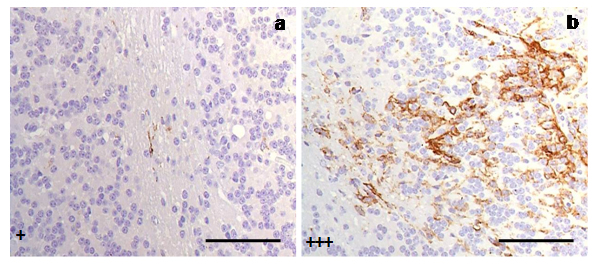 Immunostaining of reactive microglial cells in cerebella from scrapie-affected sheep demonstrated quantitative differences of reactive microglia (MHC II+CD68+IB4) in relation to PrP genotypes presented in (a) ARQ/VRQ, (b) VRQ/VRQ. Both cerebella corresponded to animals at terminal stages of the disease (scale bar: 100 µm). Immunointensity is graded according to the score established here (from negative, – to maximum, ++++), as shown on micrographs.