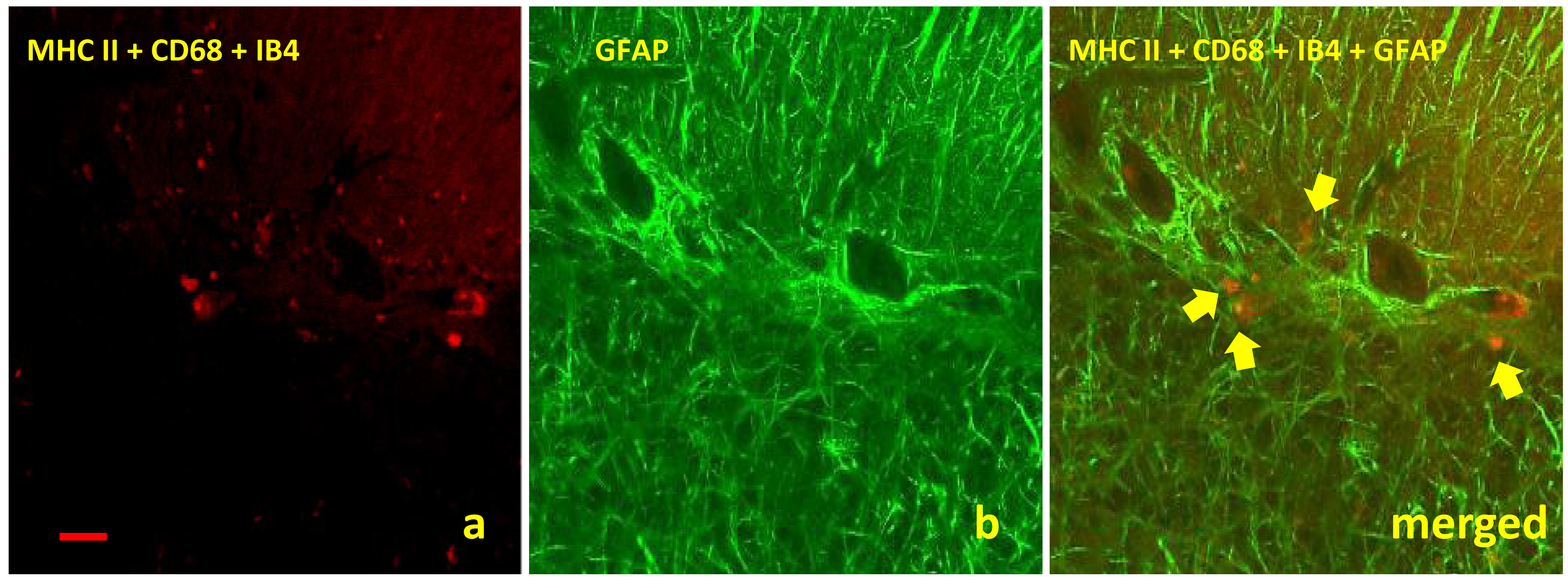 MHC II+CD68+IB4 (red immunolabelling, arrows) and GFAP (green immunolabelling),