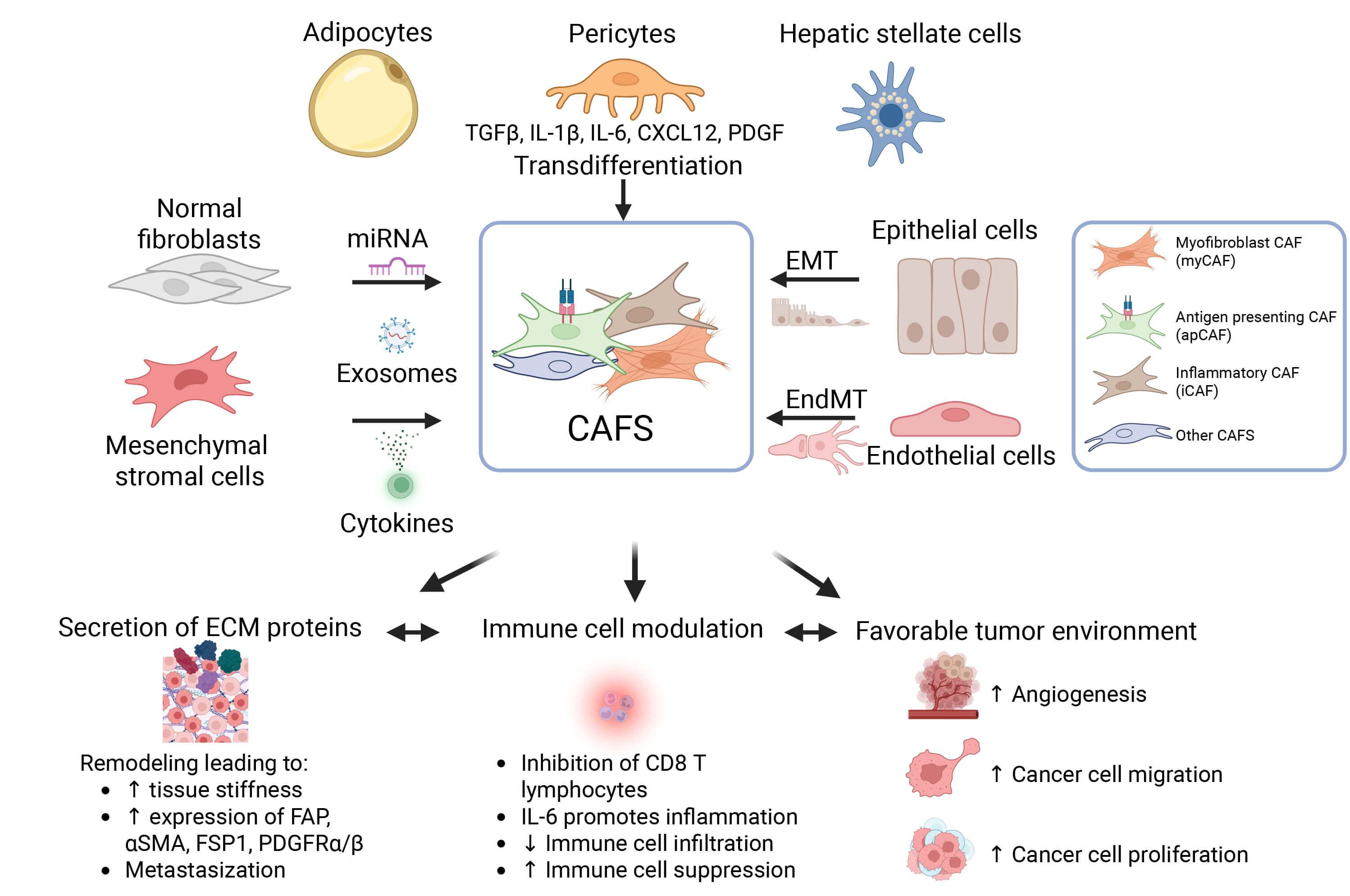 CAFs arise from normal fibroblasts, mesenchymal stromal cells, adipocytes,