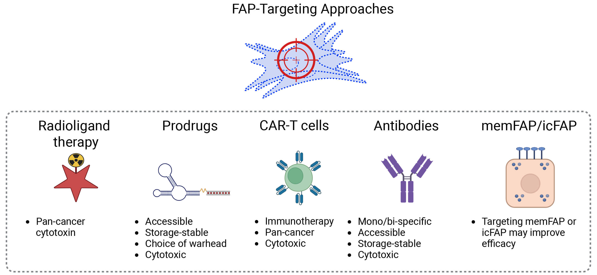 Summary of commentary. Key advantages of each prominent approach to targeting FAP and FAP+ cells. ic, intracellular; mem, membrane. Created in BioRender. Boumelhem, B. (2025) https://BioRender.com/xq3xm9k.