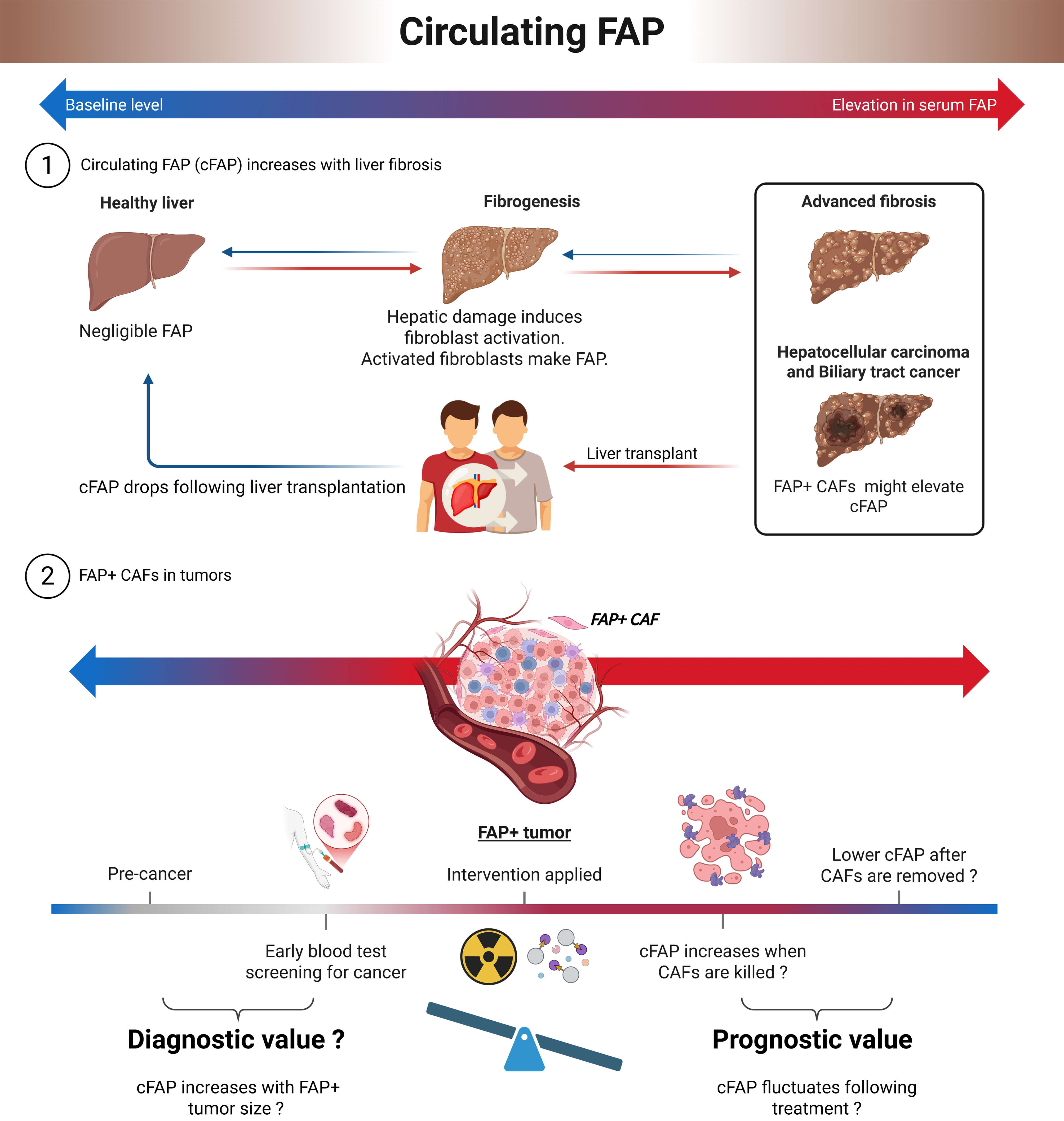 FAP-targeted PET/CT is a potential tool to monitor FAP levels before, during, and following treatment using FAP-targeted and other therapies, as seen using [89Zr] anti-FAP antibody PET/CT when developing FAP CAR-T cells [313]. A simpler method of monitoring the effectiveness of therapies that are designed to eliminate FAP+ cells might be the lowering of circulating levels of soluble FAP (cFAP), as occurs following removal of a cirrhotic liver by liver transplantation [172] (Fig. 4).
