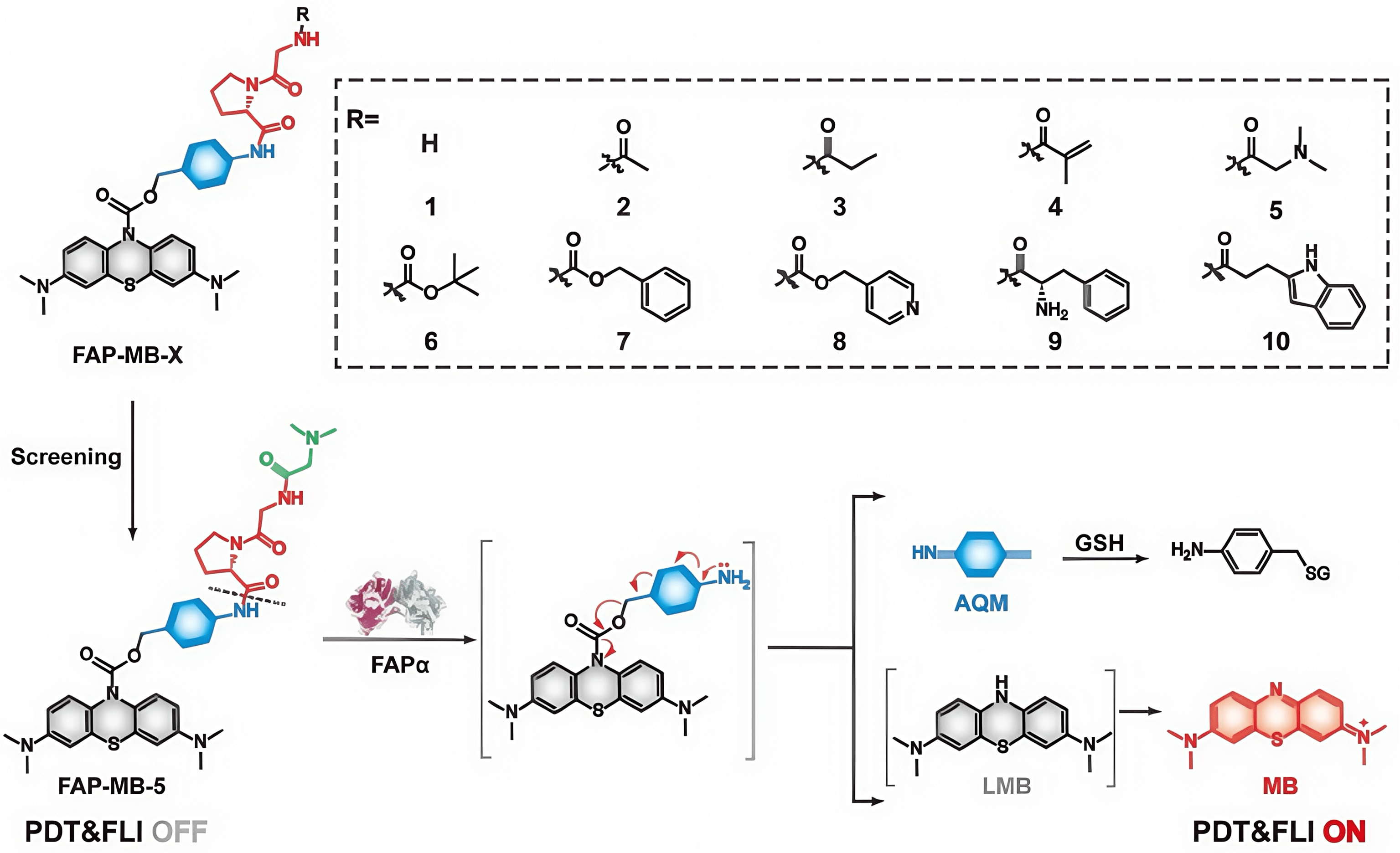 Schematic of a FAP-activated theranostic photosensitizer class. Structures of FAP activatable methylene blue (MB) derivatives FAP-MB-1–10, and mechanism of action [242]. Derivative FAP-MB-5 has been found to be the most efficiently hydrolyzed by FAP (at dotted line). PDT, photodynamic; FLI, fluorescence imaging; AQM, azaquinone methide; SH, glutathione; LMB, leucomethylene blue. Figure adapted from [242].