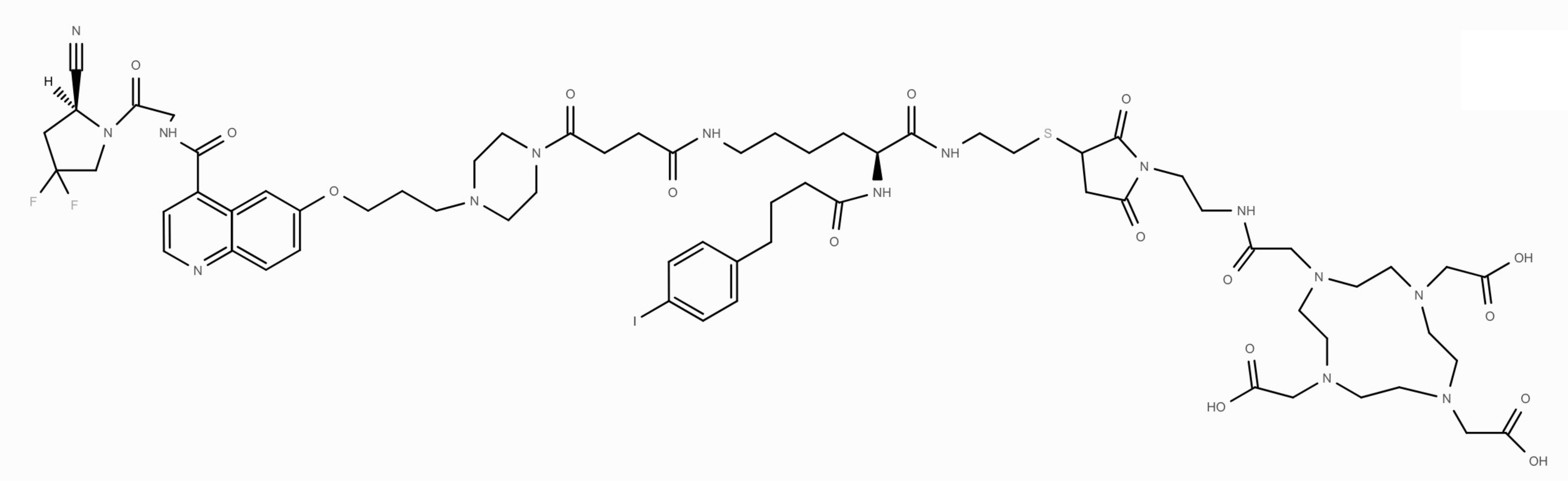 The cyclic peptide FAPI-2286 (Fig. 5) [270, 307] was developed to address the low tumour retention of FAPI radiotracers that are based on UAMC-1110. Longer tumour retention time is needed for the therapeutic use of a FAPI. Compared to FAPI-46, FAPI-2286 yields greater signal intensity in the kidney, liver, and heart [270, 308]. In preclinical tests, FAPI-2286 shows longer tumour retention than FAPI-46 [309]. Moreover, FAPI-2286 presents a significant advantage in identifying patients with muscle-invasive bladder cancer who may not benefit from radical surgery, as it can discriminate between false-positive and false-negative results that arise from conventional imaging [310]. In summary, FAPI-2286 has displayed superior FAP binding affinity, tumour accumulation, and tumour retention times compared to the UAMC-1110 series of compounds.