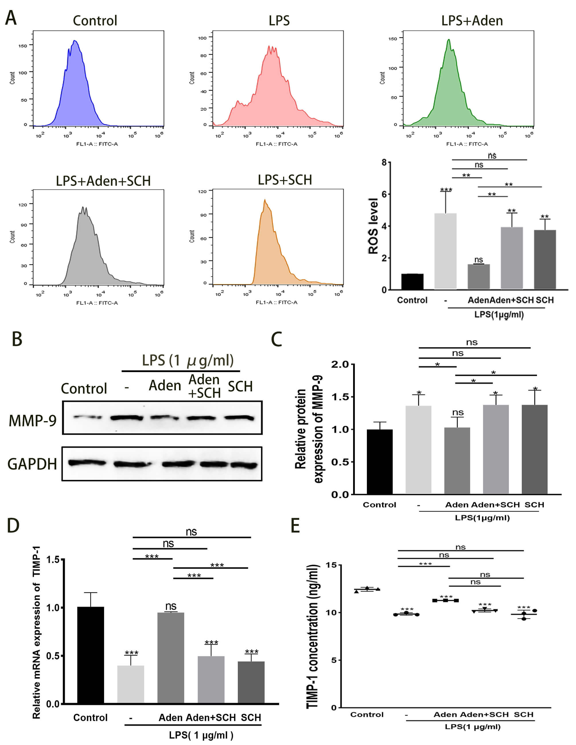 The overproduction of ROS is closely associated with disruption of the BBB [18, 25]. Furthermore, several studies have reported that tissue damage is closely related to an increased level of MMP-9 [26, 27, 28, 29]. The present study investigated the effects of adenosine on ROS and MMP-9 levels in PVM/Ms. ROS levels were found to be markedly increased following LPS treatment of PVM/Ms. Adenosine treatment reduced the level of ROS, but this effect was reversed by treatment with the A2AR antagonist SCH58261 (Fig. 2A). In addition, Western blot, qRT-PCR and ELISA assays revealed that MMP-9 expression in PVM/Ms increased following LPS treatment, whereas TIMP-1 expression decreased. These changes were prevented by adenosine treatment, while SCH58261 partially counteracted the effects of adenosine (Fig. 2B–E). In summary, adenosine decreased ROS levels and MMP-9 protein expression, and increased TIMP-1 expression in LPS-treated PVM/Ms. These effects appear to be mediated via A2AR.