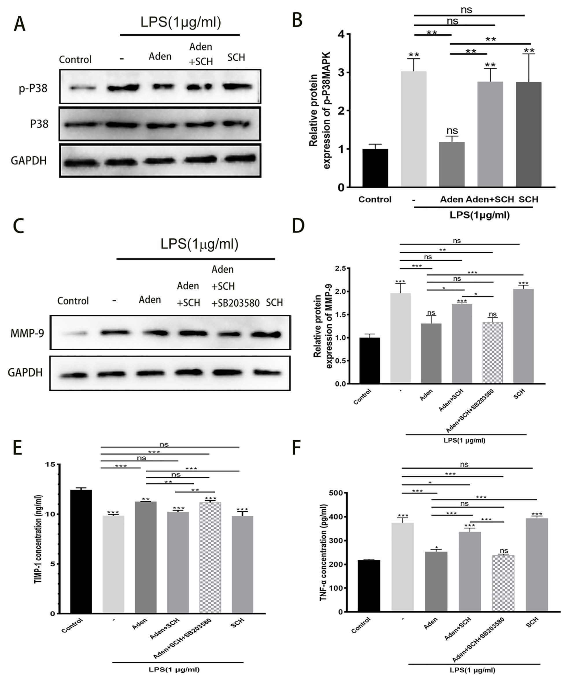 LPS treatment significantly changed the production of inflammatory factors, including IL-6 and TNF-α, as well as MMP-9, TIMP-1, and PEDF. These changes were abrogated by adenosine, which also reduced the production of reactive oxygen species (ROS) and inhibited the activation of PVM/Ms. SCH58261 partially reversed the effects of adenosine following LPS treatment. The p38 MAPK pathway was found to be involved in adenosine regulation of LPS-induced PVM/Ms.