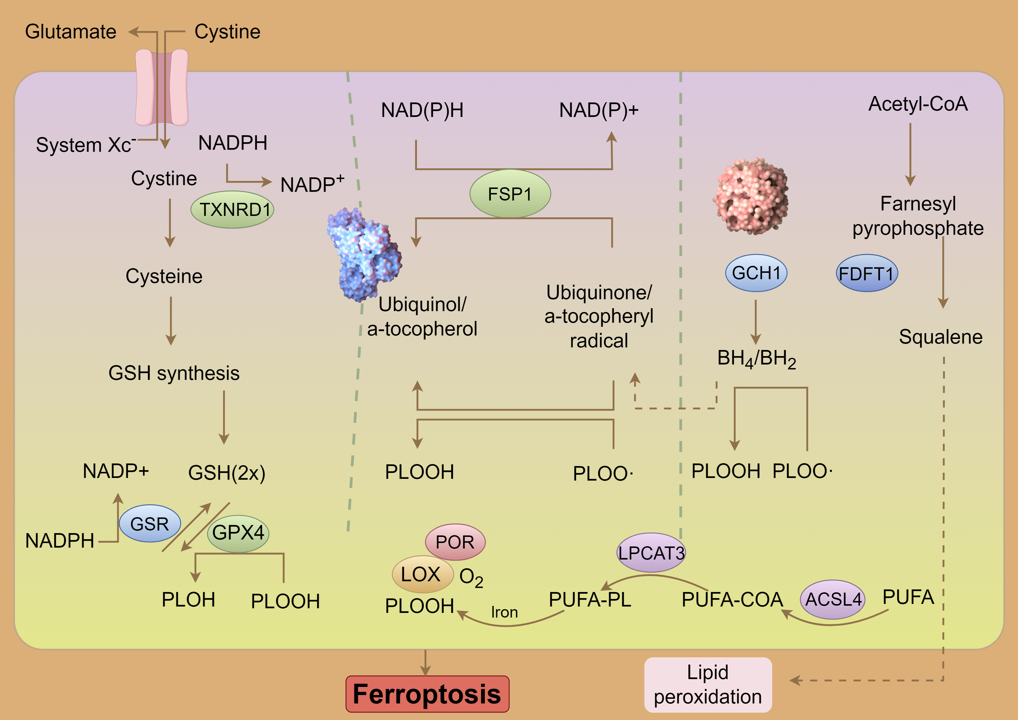 Fig. 2. System Xc–-GSH-GPX4 pathway and ferroptosis. NADPH, Nicotinamide Adenine Dinucleotide Phosphate (Reduced); NADP, Nicotinamide Adenine Dinucleotide Phosphate; TXNRD1, Thioredoxin Reductase 1; GSH, Glutathione (Reduced form); PLOH, Phospholipid Alcohol; PLOOH, Phospholipid Hydroperoxide; PLOO-, Phospholipid Peroxyl Radical; FSP1, Ferroptosis Suppressor Protein 1; POR, Cytochrome P450 Oxidoreductase; LOX, Lipoxygenase; PUFA-PL, Polyunsaturated Fatty Acid-Containing Phospholipid; LPCAT3, Lysophosphatidylcholine Acyltransferase 3; COA, Coenzyme A; ACSL4, Acyl-CoA Synthetase Long-Chain Family Member 4; PUFA, Polyunsaturated Fatty Acid; GCH1, GTP Cyclohydrolase 1; FDFT1, Farnesyl-Diphosphate Farnesyltransferase 1; BH4/BH2, Tetrahydrobiopterin/Dihydrobiopterin; GSR, glutathione-disulfide reductase. By Figdraw (https://www.figdraw.com/#/).