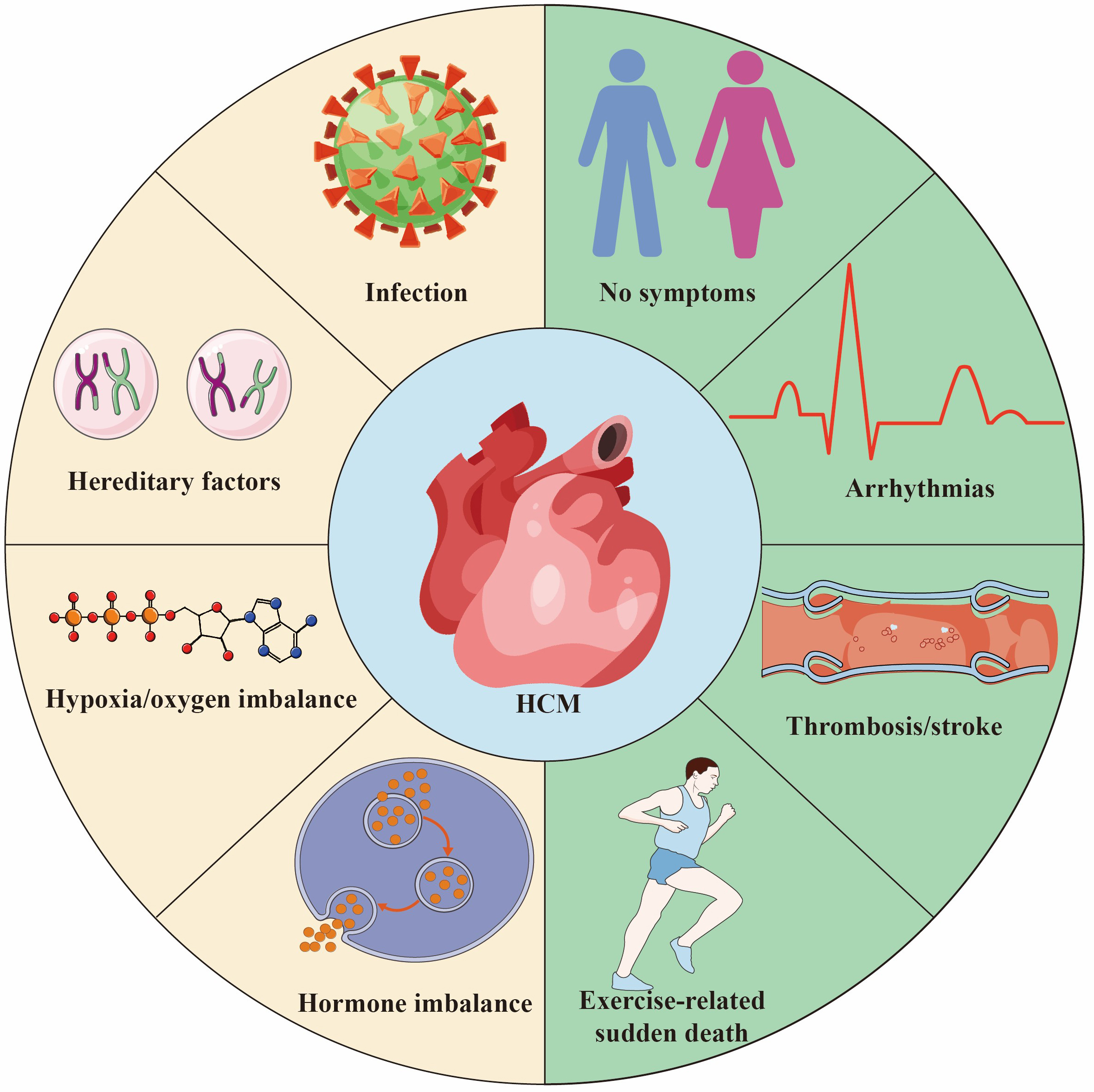 Fig. 1. Hypertrophic Cardiomyopathy (HCM) is a common hereditary heart disease, 30%–60% of the causes are due to genetic factors. Other causes include infection/inflammation, hypoxia/oxygen supply imbalance and endocrine factors. The outcome of HCM varies depending on individual differences and the severity of the disease. Some people are asymptomatic or have mild symptoms throughout their lives and live a normal life. Some patients suffer from thrombosis/stroke secondary to atrial fibrillation. HCM is one of the main causes of sudden death in young athletes. Created by Adobe Illustrator (Adobe Inc., San Jose, CA, USA).