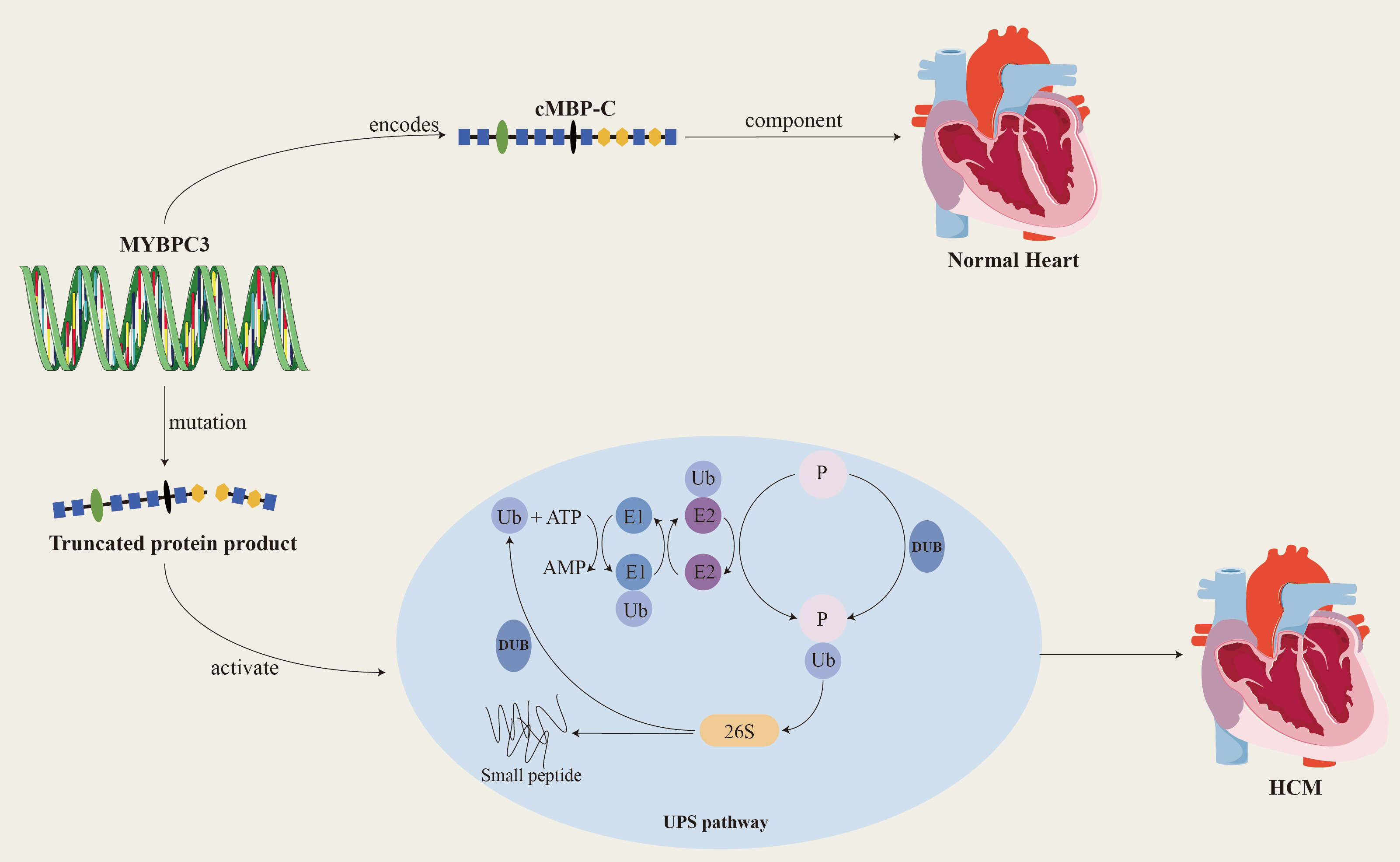 Fig. 2. MYBPC3 encodes cardiac myosin binding protein-C, which is a key structural protein of the myocardium and plays an important role in the relaxation and contraction of the myocardium. When MYBPC3 mutates, it produces a truncated protein product that activates the UPS system and ultimately leads to HCM. cMBP-C, cardiac myosin binding protein-C; Ub, ubiquitin; E1, ubiquitin-activating enzyme; E2, ubiquitin-conjugating enzyme; DUB, deubiquitinating enzymes; UPS, ubiquitin-proteasome system; P, phosphonates. Created by Adobe Illustrator (Adobe Inc., San Jose, CA, USA).